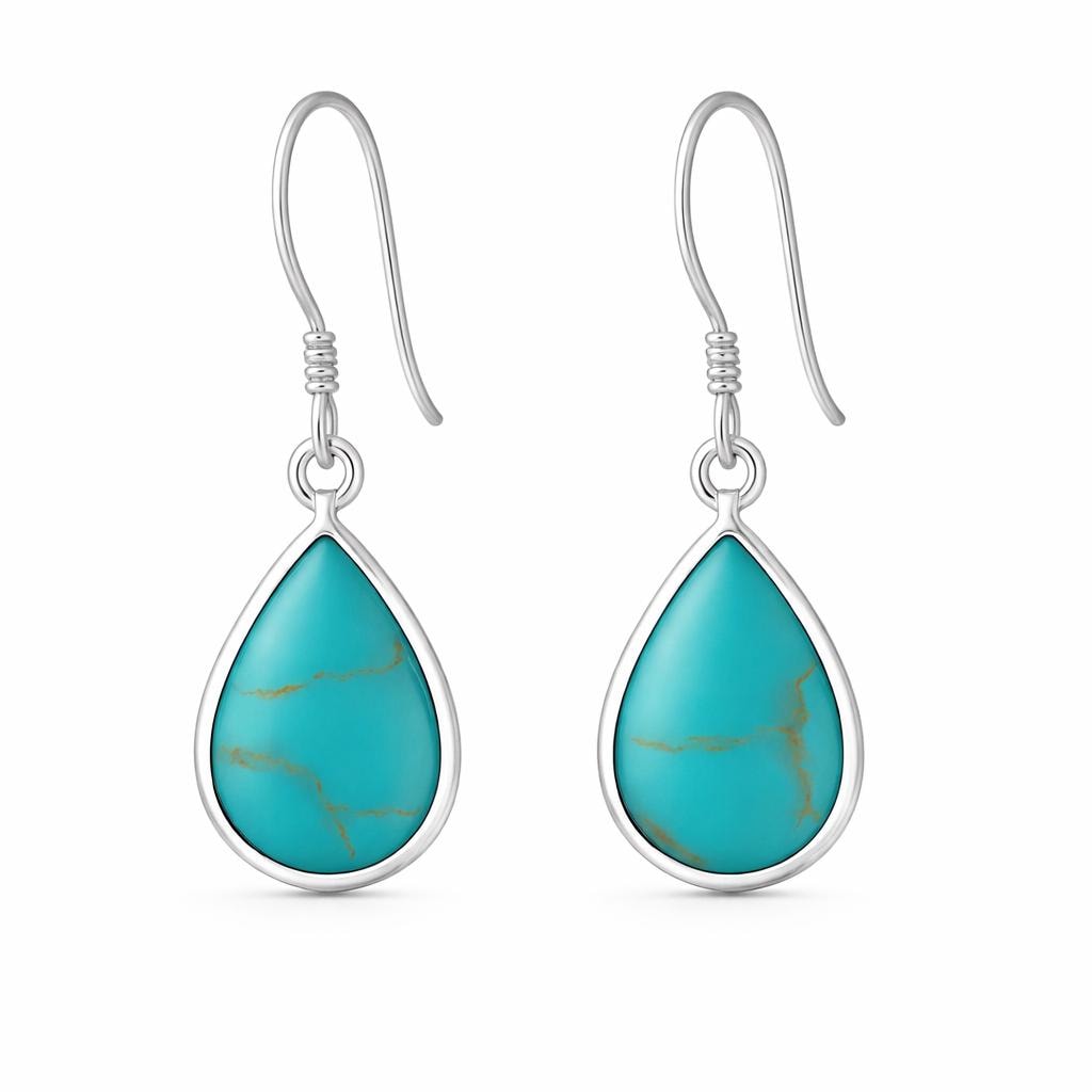 Each pair features smooth teardrop-shaped turquoise charms, bezel set in sterling silver to highlight the stone’s vibrant blue tone and natural style veining. The elongated drop design adds gentle movement and a flattering silhouette when worn.