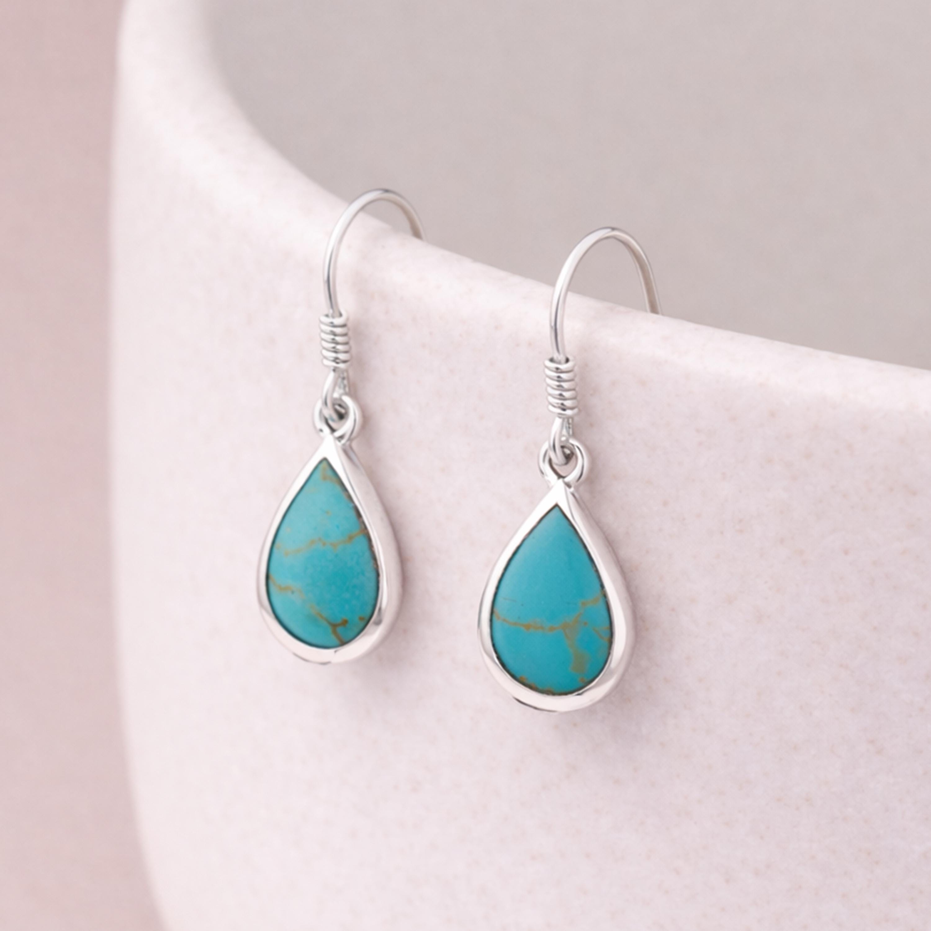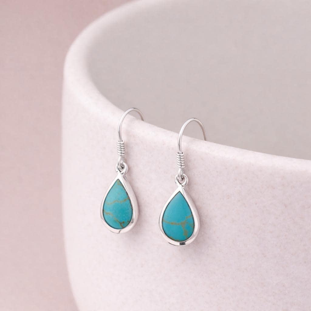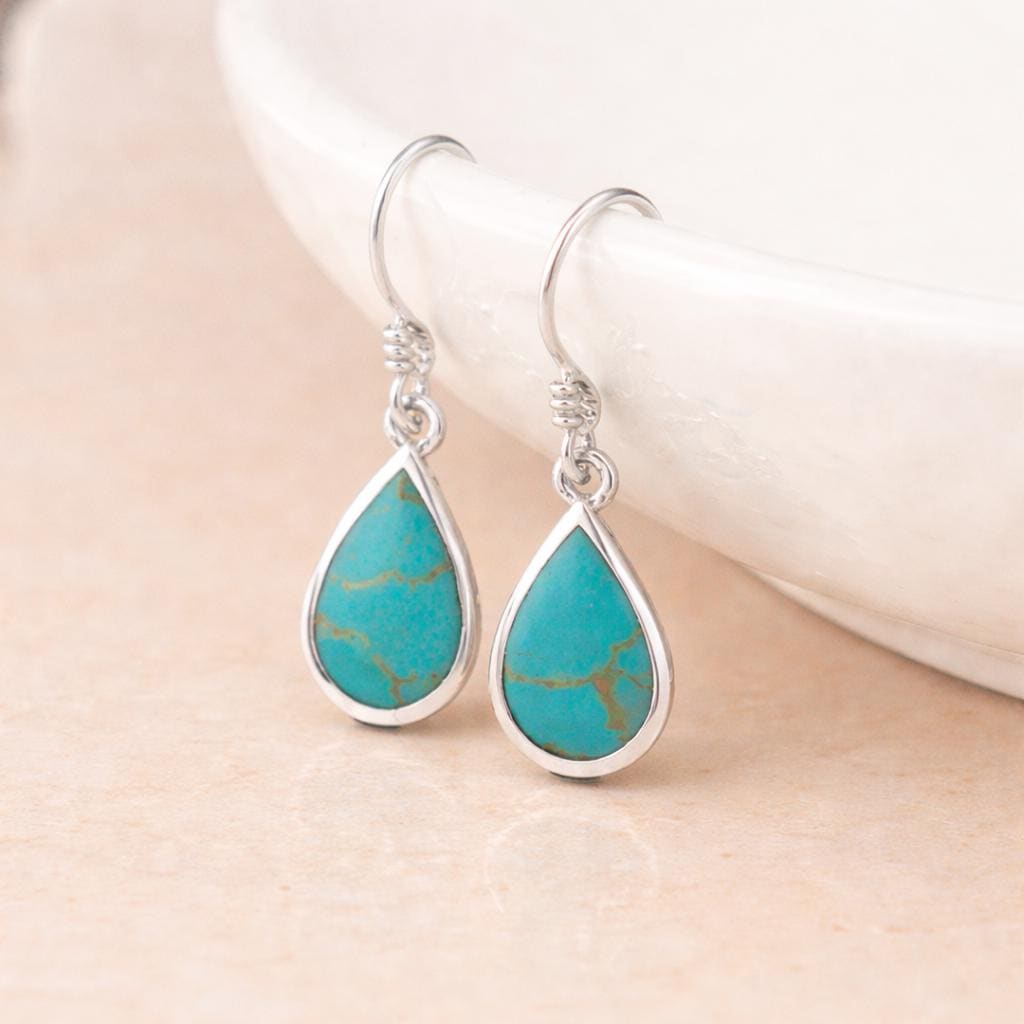 These sterling silver turquoise drop earrings are crafted from solid 925 sterling silver and set with genuine reconstituted turquoise gemstones, creating a fresh and timeless design with a pop of colour.