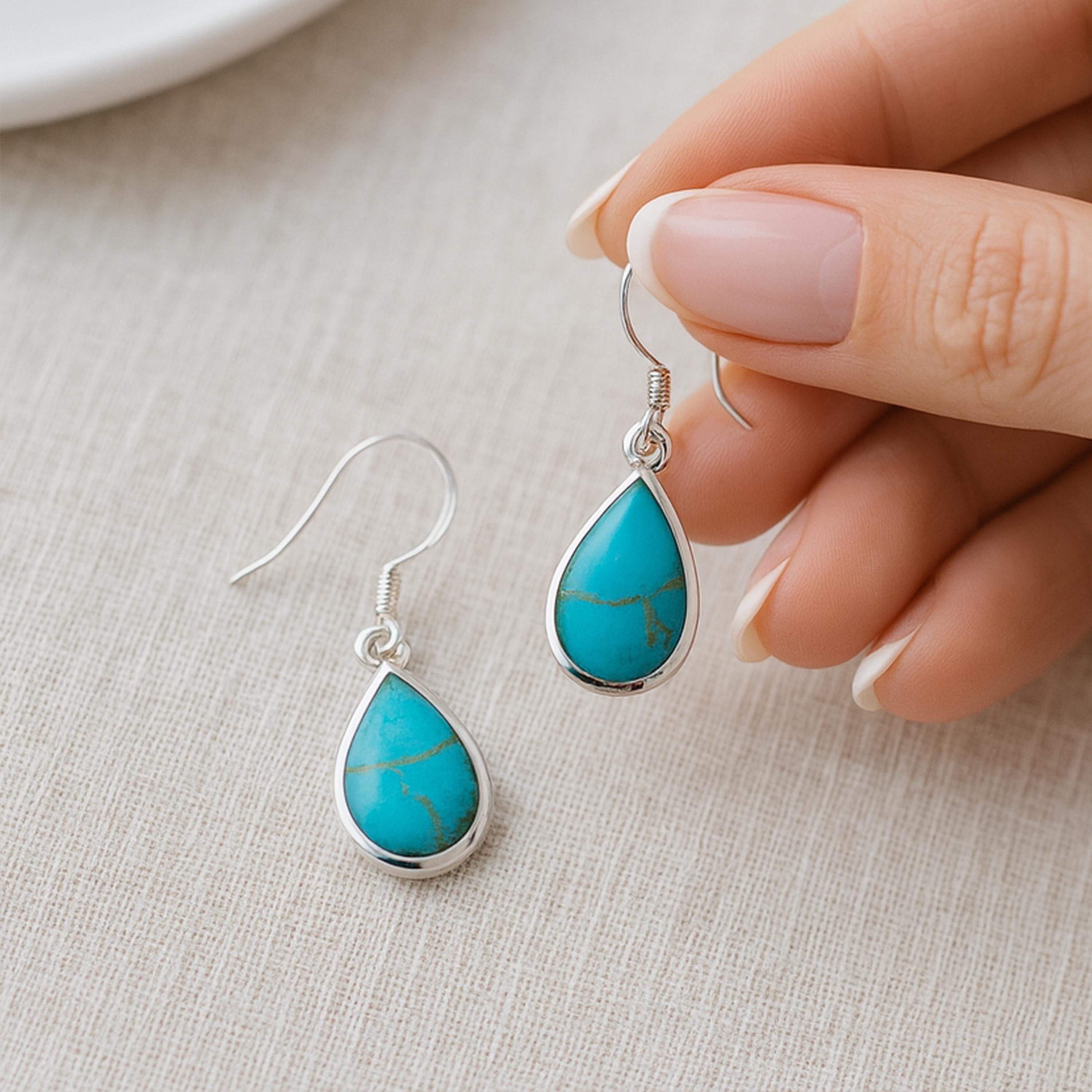 Elegant silver teardrop earrings with vibrant turquoise — the perfect pop of colour for any season.