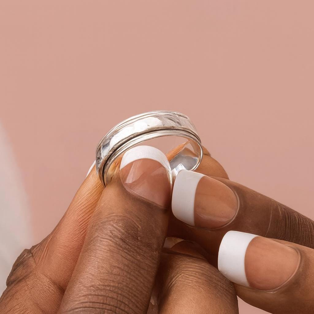 Handcrafted from solid 925 sterling silver, the 6mm inner band has a softly hammered finish that catches the light beautifully. The 4mm spinner band glides smoothly around the ring, offering a calming, tactile feel — perfect for easing stress or keeping busy hands occupied. Whether worn daily as a statement piece, a mindfulness aid, or gifted for a special occasion, adding your personal engraving makes it one-of-a-kind.