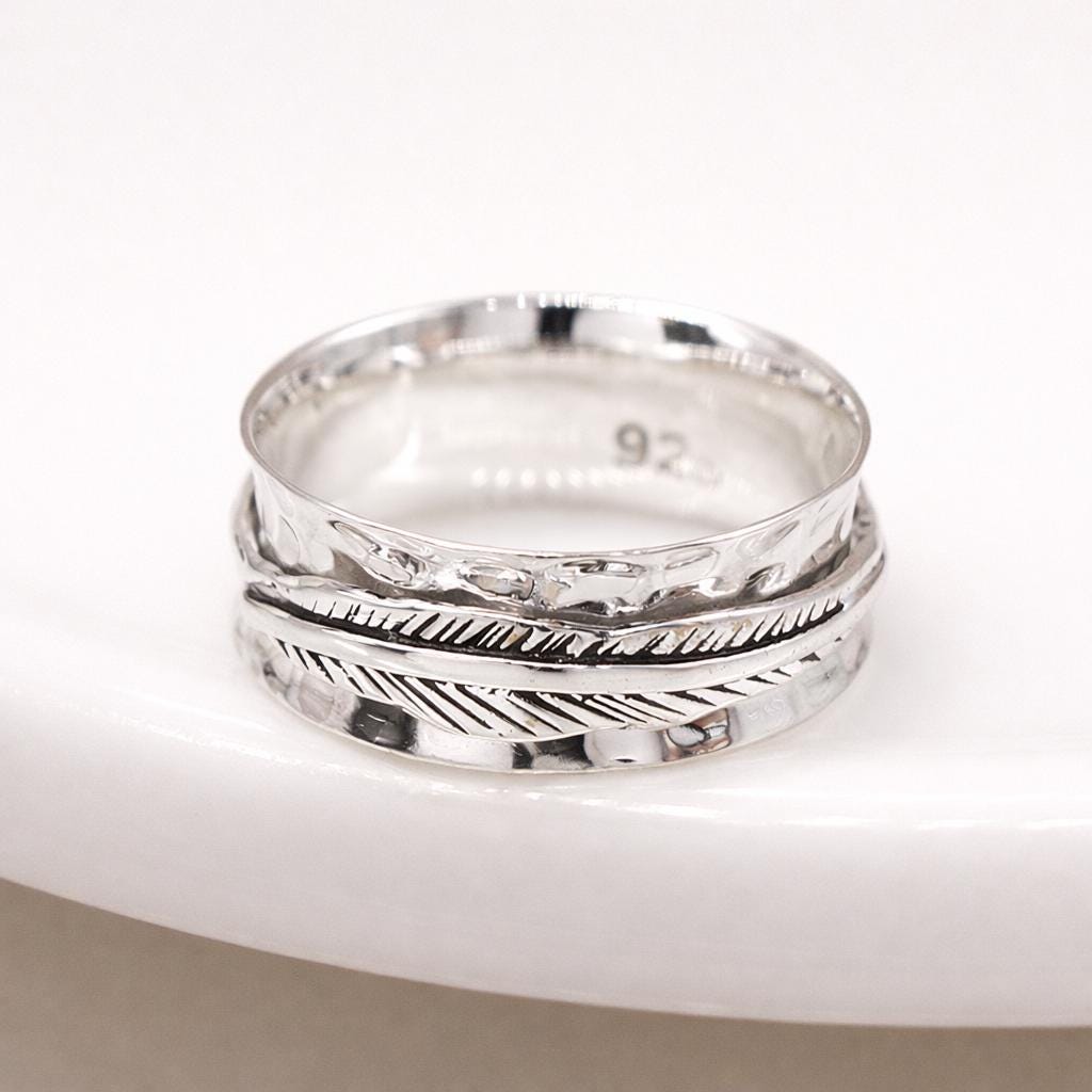 Made by hand from solid 925 sterling silver, this ring is carefully shaped with a smooth 10mm wide band for comfort and durability. Two delicate feather detailed bands sit around the ring and rotate freely, adding gentle movement and a tactile, soothing element. The feather design symbolises freedom, guidance, and protection, making this ring both meaningful and wearable.