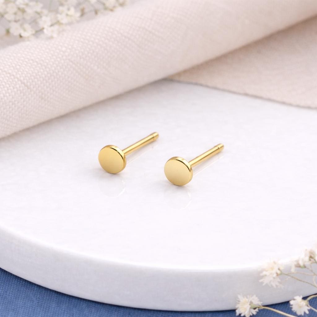 These gold disc stud earrings are handcrafted from solid 925 sterling silver with 18ct yellow gold plating, featuring a smooth, polished circular design that’s perfect for everyday wear. Nickel-free and hypoallergenic, they are gentle on sensitive ears and comfortable to wear all day.
