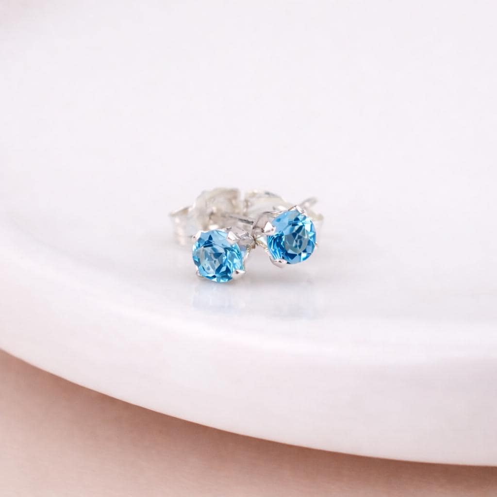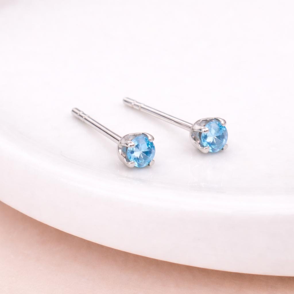 These aquamarine coloured stud earrings are handcrafted from solid 925 sterling silver and set with a sparkling light blue cubic zirconia, offering a soft, elegant pop of colour in a delicate everyday design. Nickel free and hypoallergenic, they are comfortable for sensitive ears and ideal for daily wear.