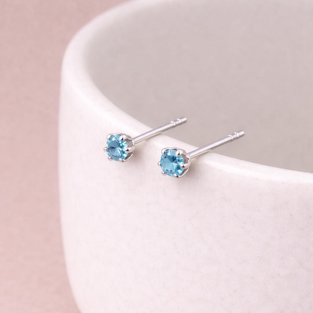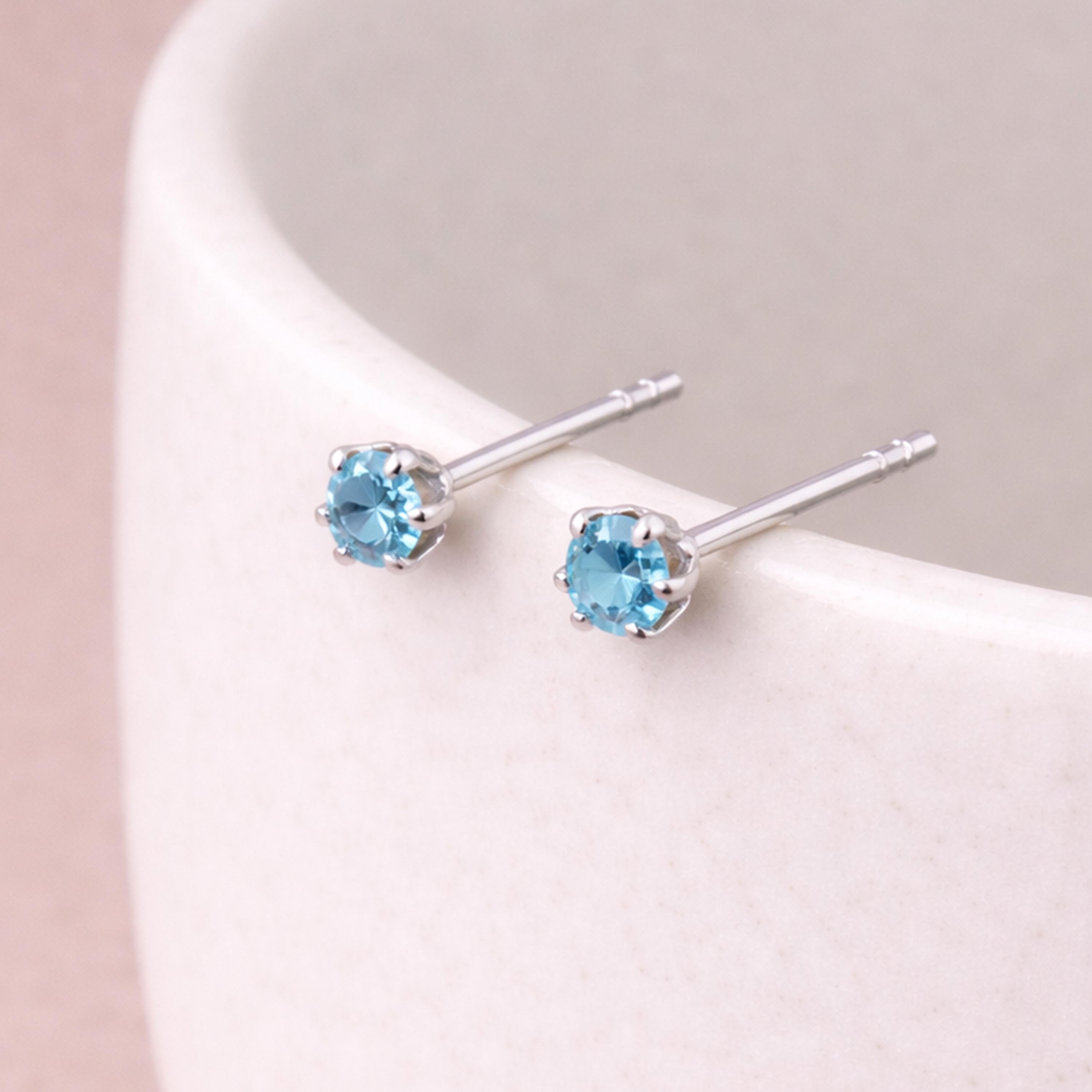 These aquamarine coloured stud earrings are handcrafted from solid 925 sterling silver and set with a sparkling light blue cubic zirconia, offering a soft, elegant pop of colour in a delicate everyday design. Nickel free and hypoallergenic, they are comfortable for sensitive ears and ideal for daily wear.