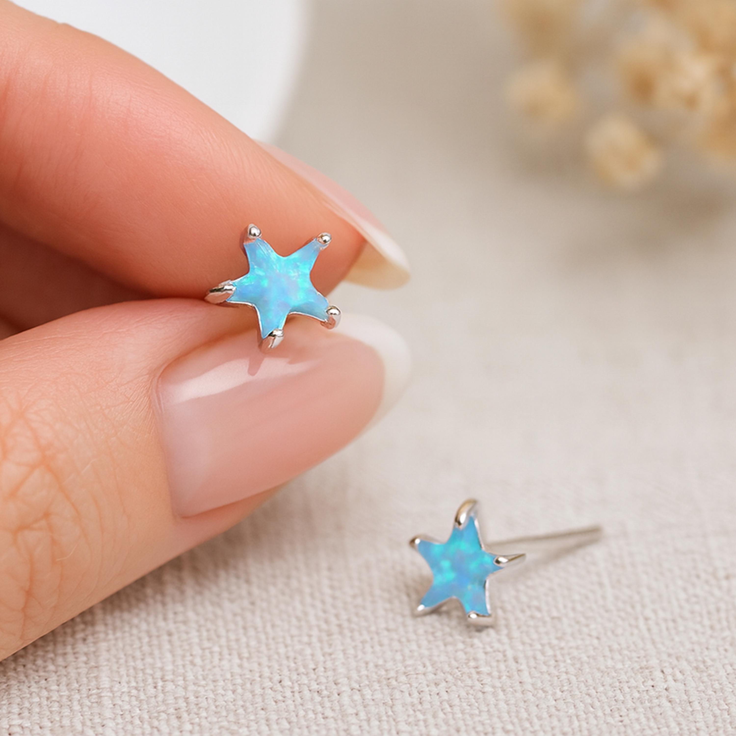 Sterling silver star studs with shimmering blue opal — a celestial-inspired design perfect for everyday wear or gifting.