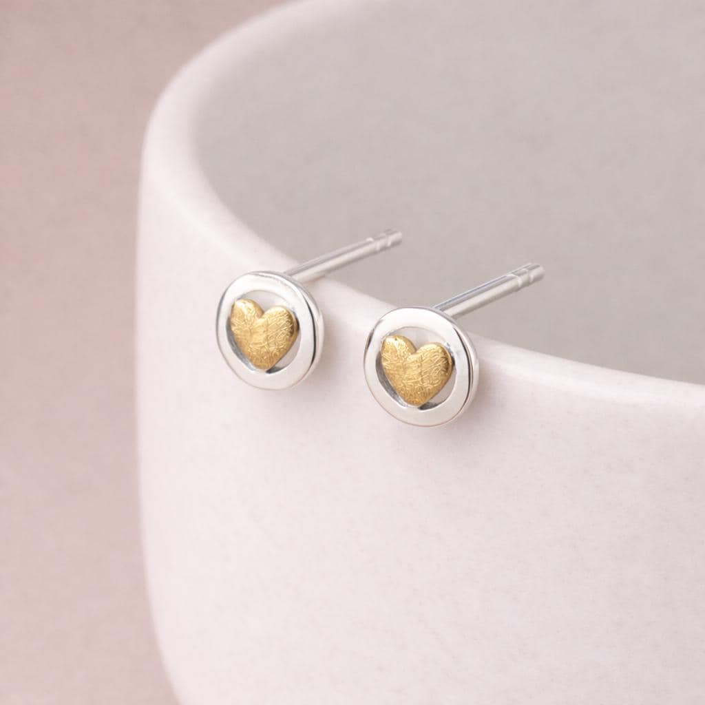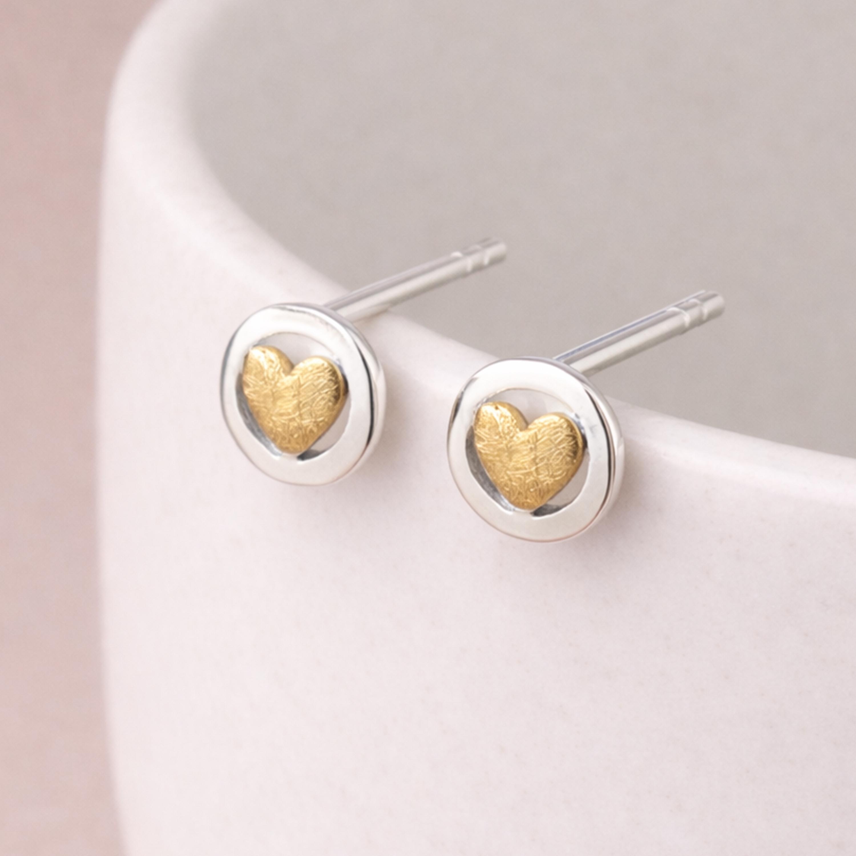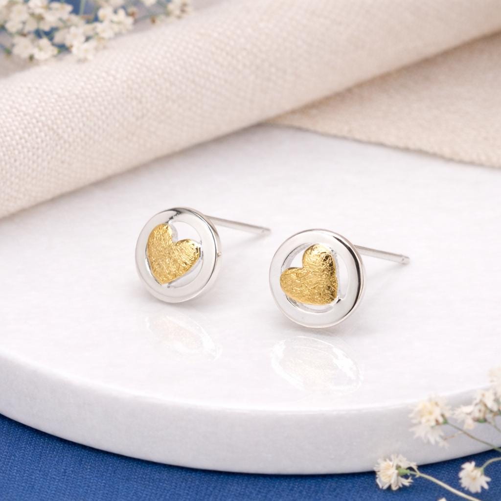 These heart stud earrings are handcrafted from solid 925 sterling silver with an 18ct yellow gold plated heart, set within a smooth silver circle for a timeless, minimalist finish. Nickel free and hypoallergenic, they are gentle on sensitive ears and comfortable for everyday wear.