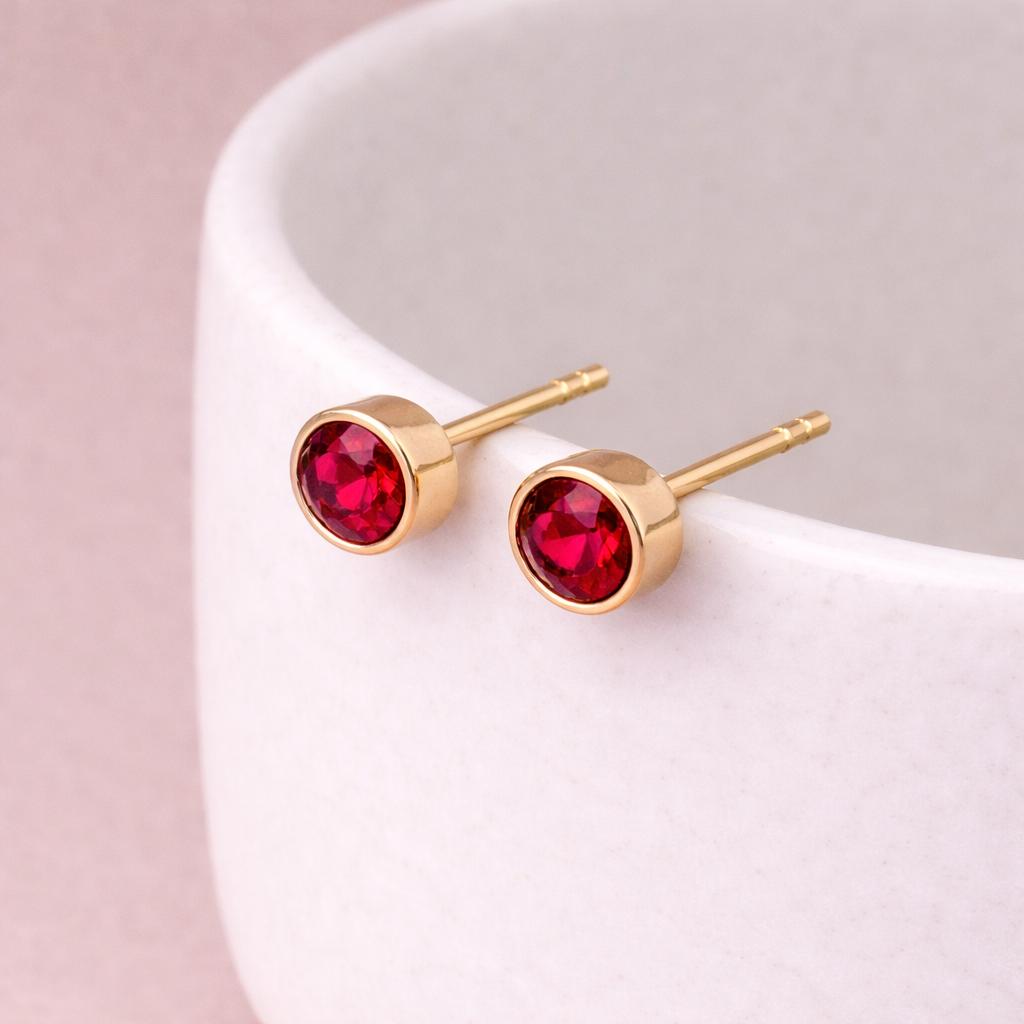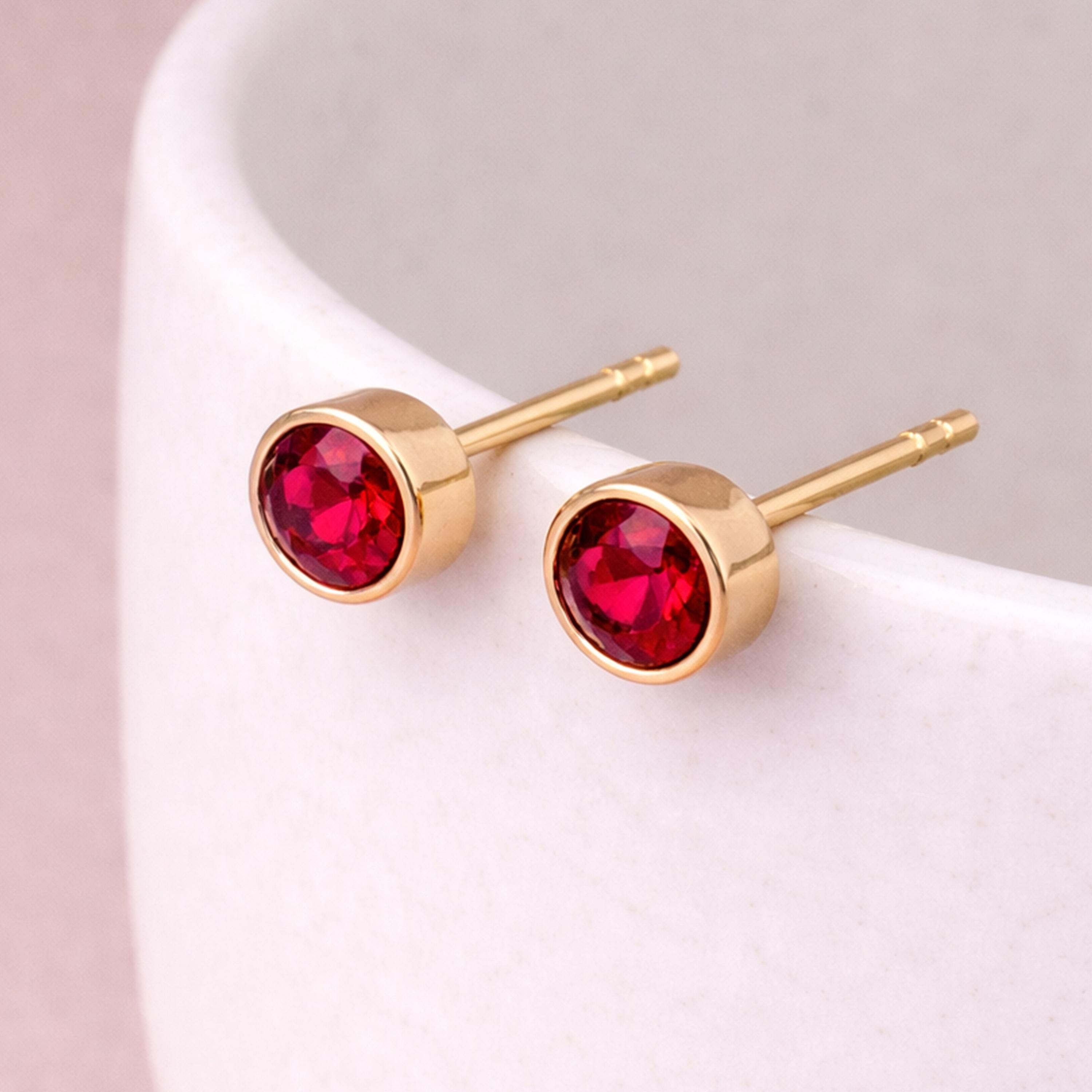 These sterling silver July birthstone stud earrings with yellow gold plating are handcrafted with a smooth bezel set ruby coloured cubic zirconia, offering a classic design with rich red tones.
