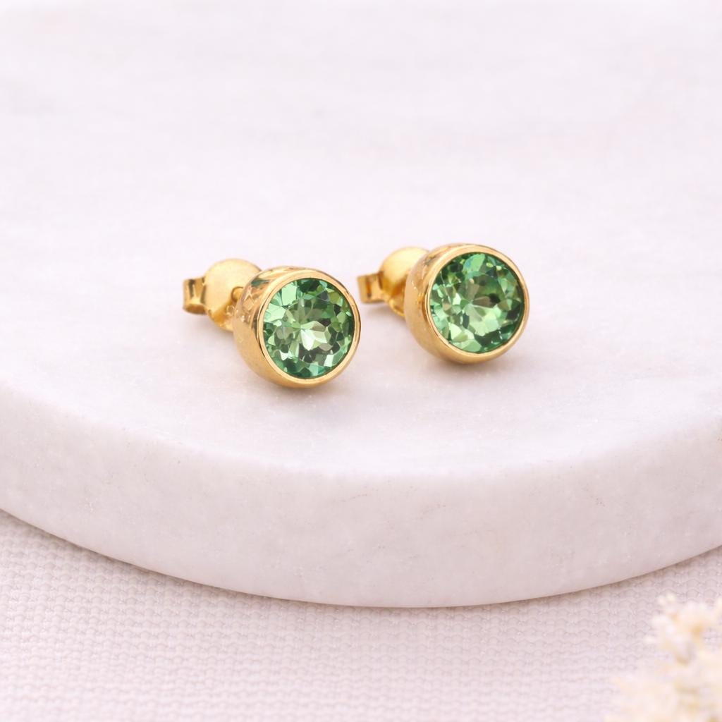 These August birthstone stud earrings are handcrafted from solid 925 sterling silver with 18ct yellow gold plating and set with a peridot coloured cubic zirconia, creating a fresh green focal point with a bright, elegant finish.