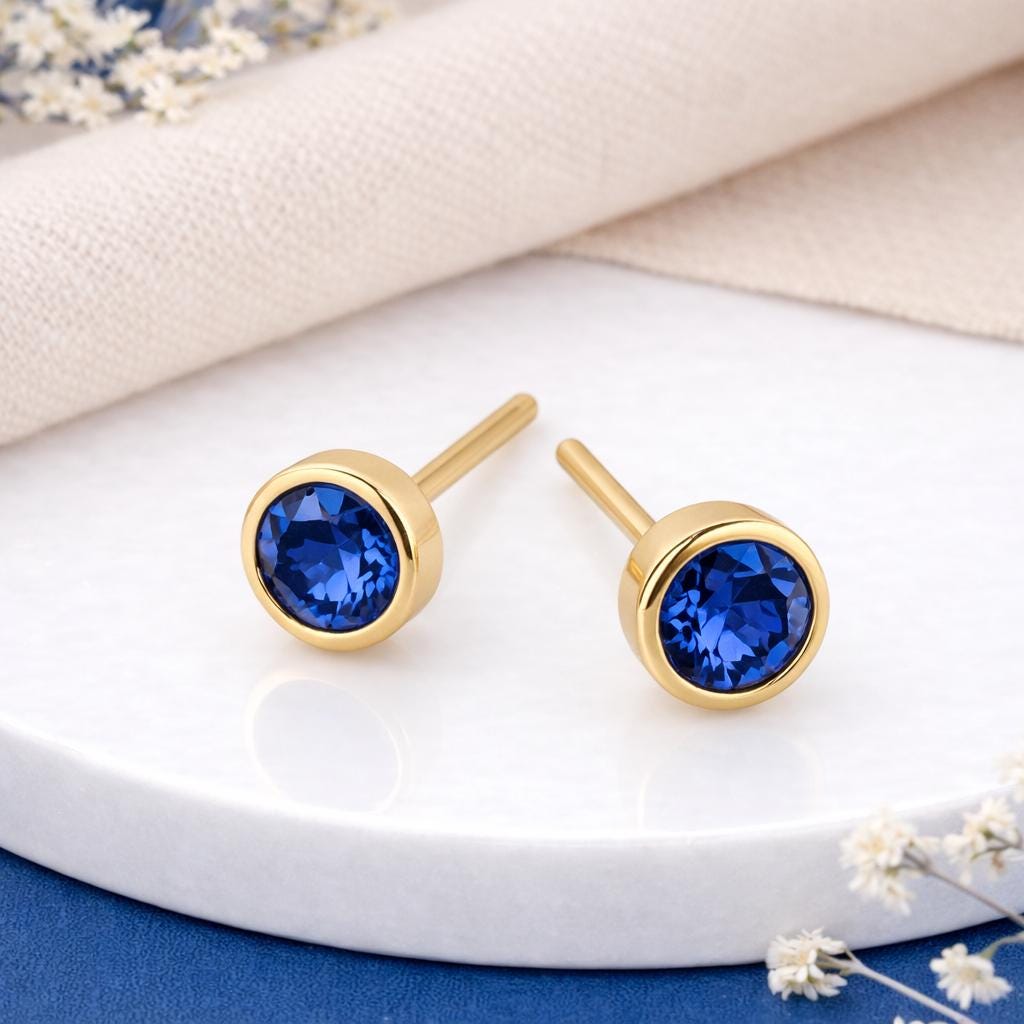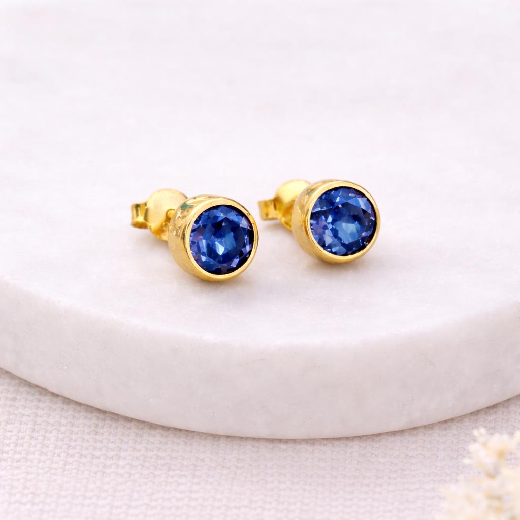 These September birthstone stud earrings are handcrafted from solid 925 sterling silver with 18ct yellow gold plating and set with a sapphire coloured cubic zirconia, creating a deep blue focal point with a classic, elegant finish.