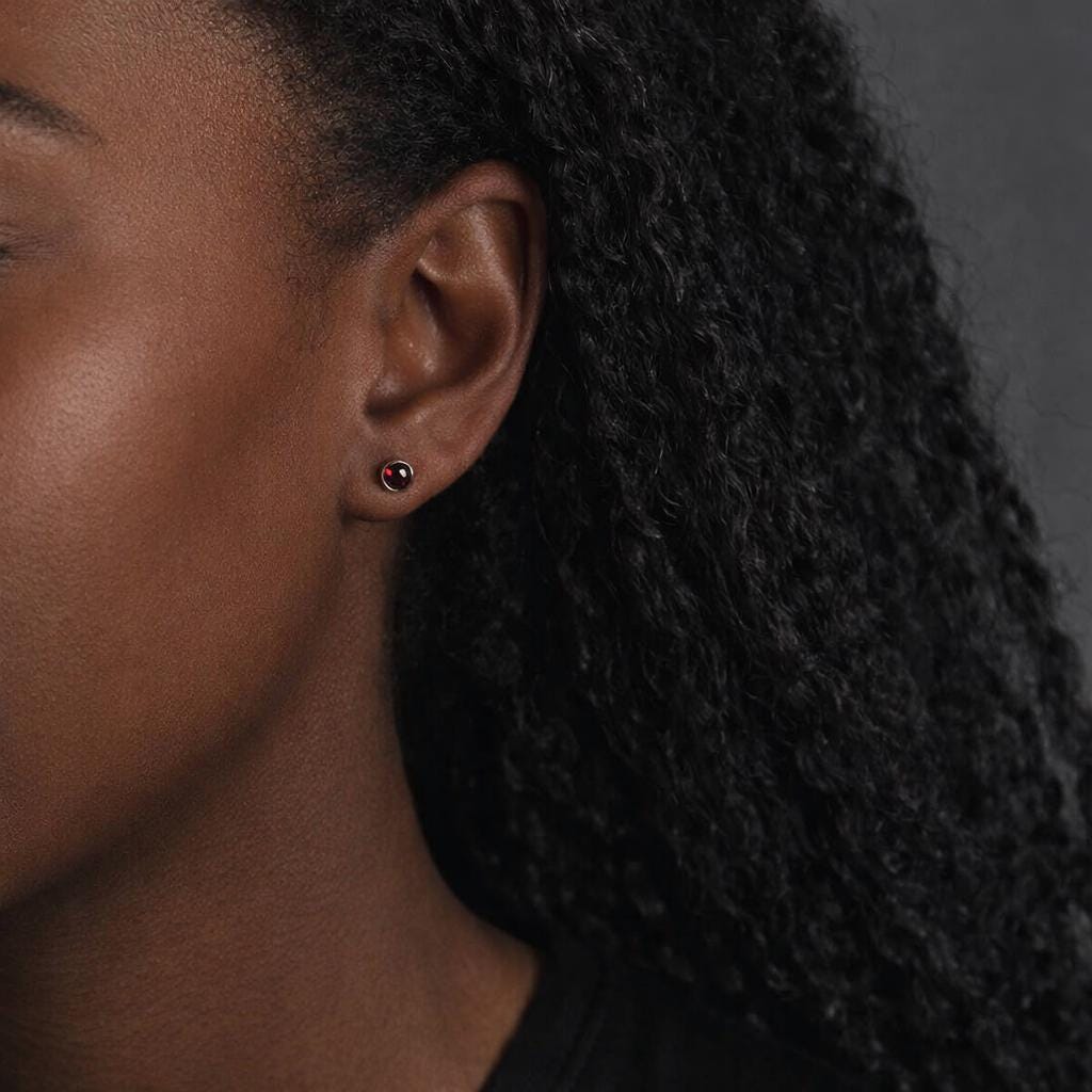 Each pair features a round garnet cubic zirconia stone bezel set in polished sterling silver. The rich red tone adds warmth and depth, while the smooth bezel setting gives the earrings a clean, modern finish and keeps the stones secure.