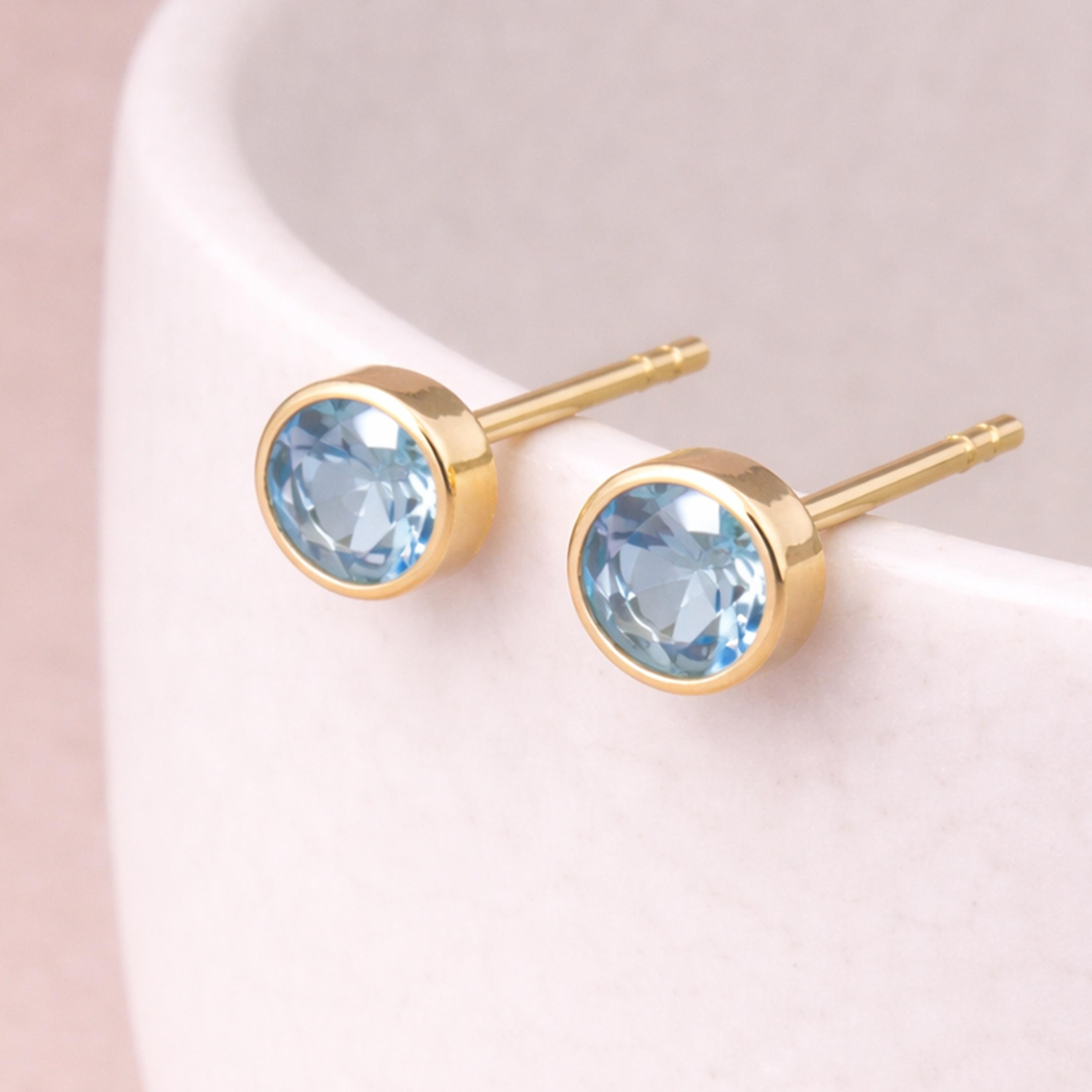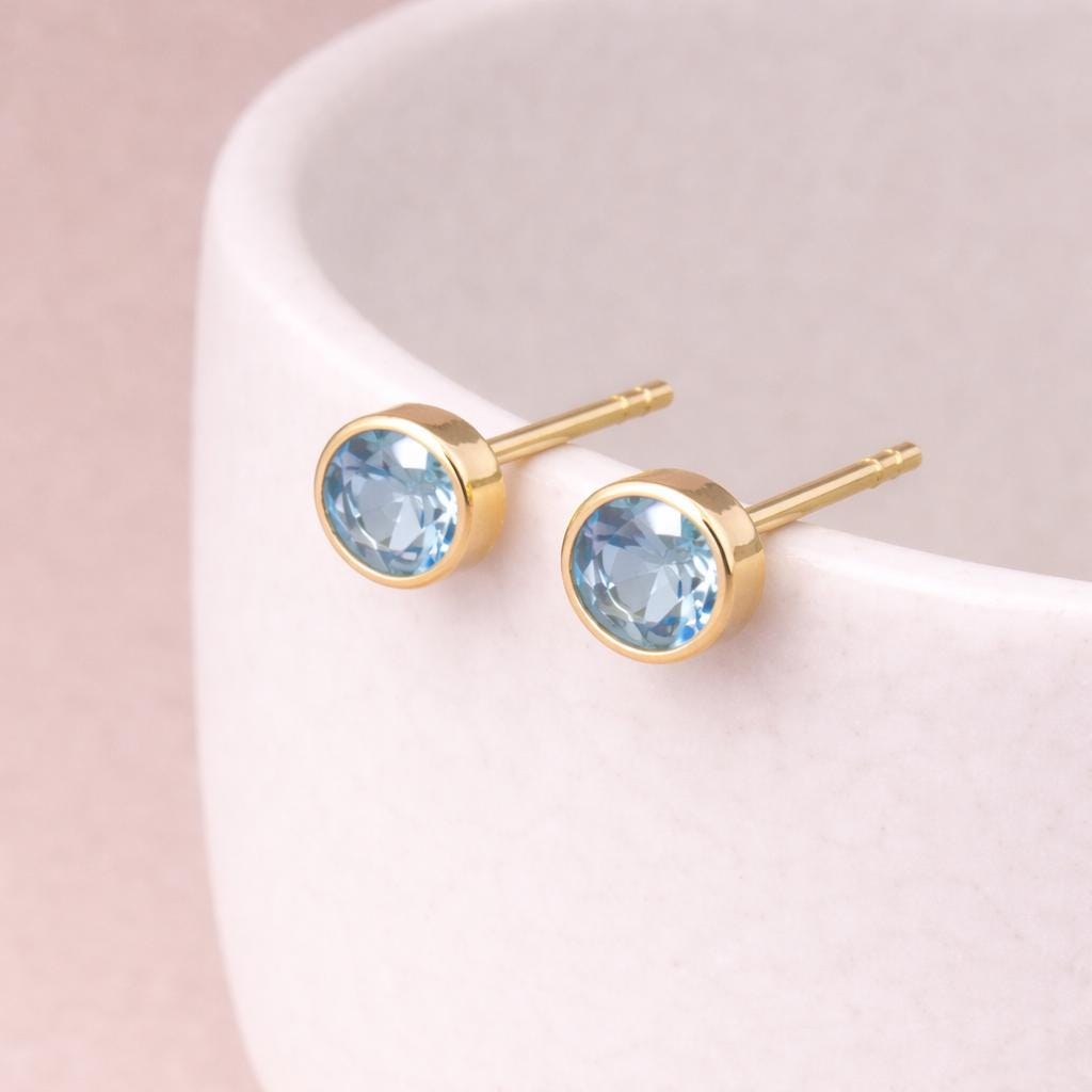 These March birthstone stud earrings are handcrafted from solid 925 sterling silver with 18ct yellow gold plating and set with an aquamarine coloured cubic zirconia, creating a soft blue focal point with a timeless, elegant finish.