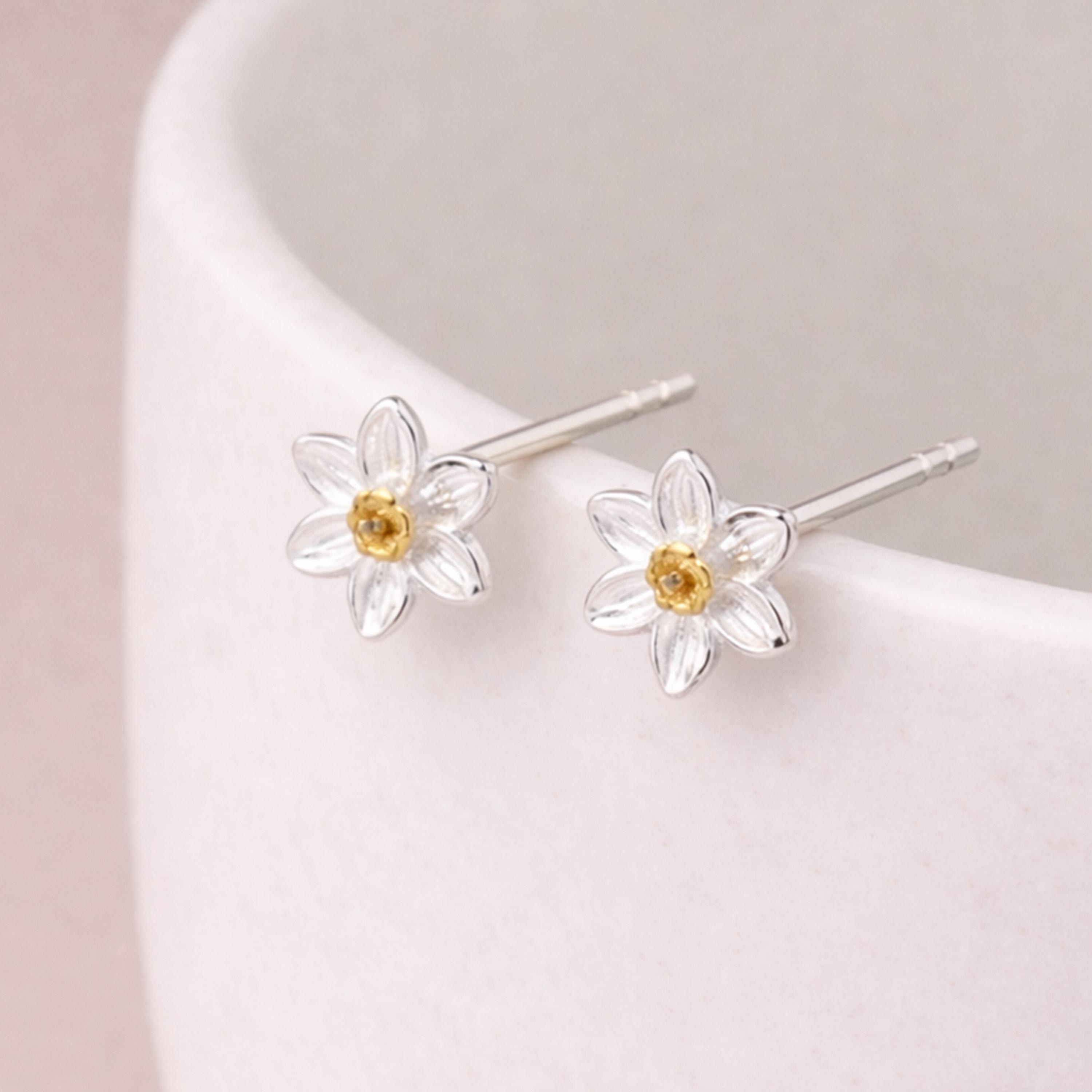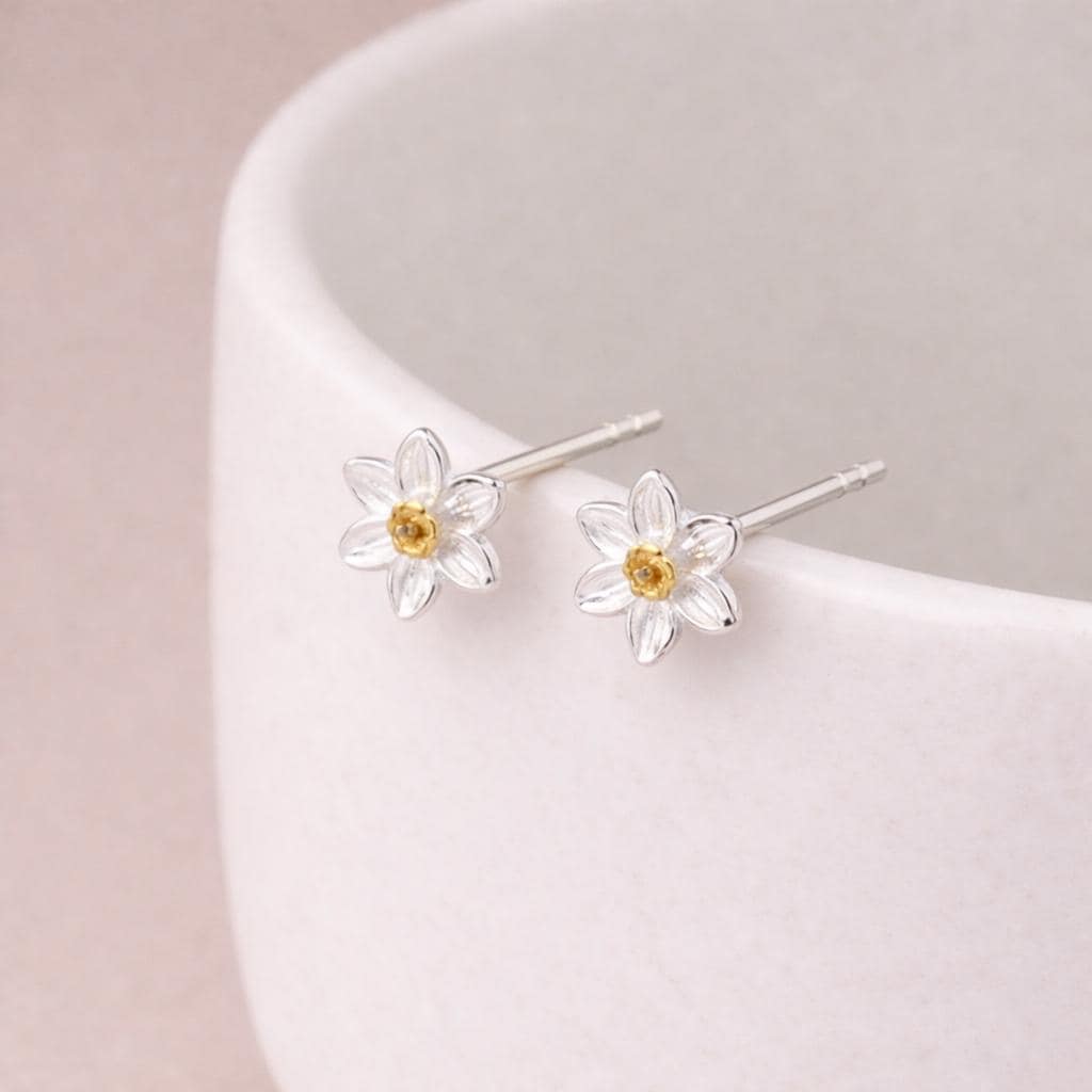 These daffodil stud earrings are handcrafted from solid 925 sterling silver with an 18ct yellow gold centre, finished in a soft silver and warm gold contrast inspired by the first flowers of spring. Nickel free and gentle on sensitive ears, they are designed for comfortable everyday wear or meaningful gifting.