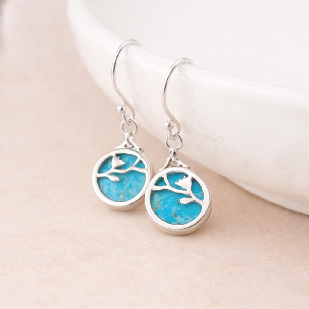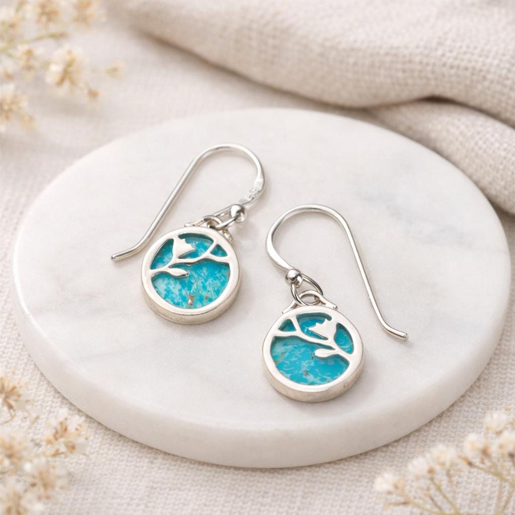 Each pair showcases a round turquoise charm with a fine cut-out flower motif layered over the stone. The turquoise adds a soft pop of colour, while the polished silver frame keeps the look clean and timeless. Lightweight and comfortable, they offer gentle movement when worn.