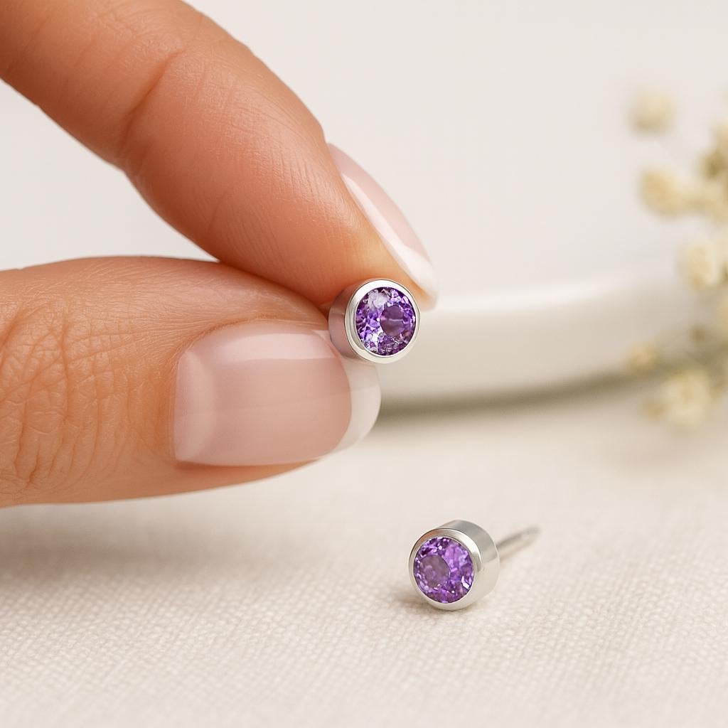 Elegant, calming and effortlessly wearable — these sterling silver stud earrings feature rich, purple amethyst-coloured cubic zirconia stones in a sleek bezel setting. At 7mm across, they offer just the right amount of sparkle for everyday or evening wear.