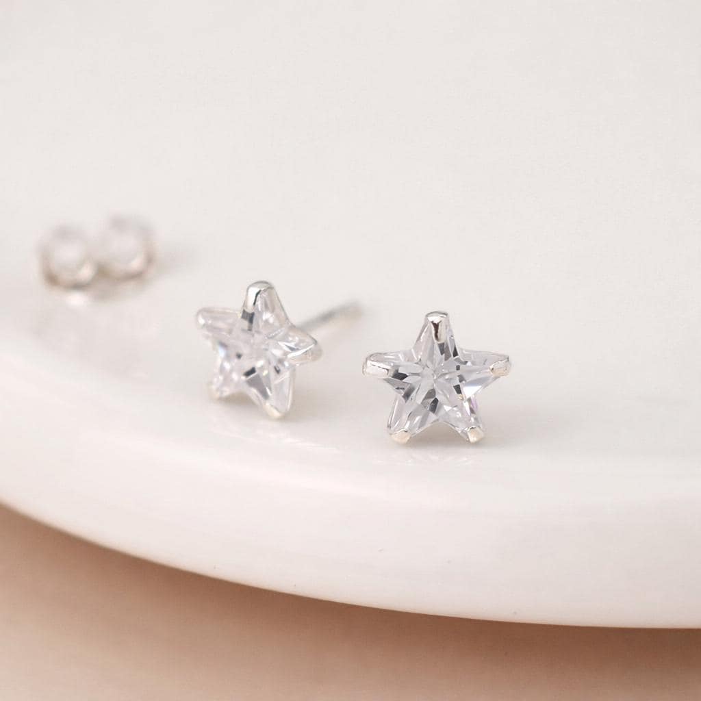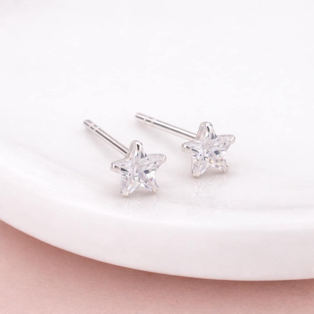 These cubic zirconia star stud earrings are handcrafted from solid 925 sterling silver and set with a sparkling clear cubic zirconia, creating a timeless star shaped design with bright, elegant shine.