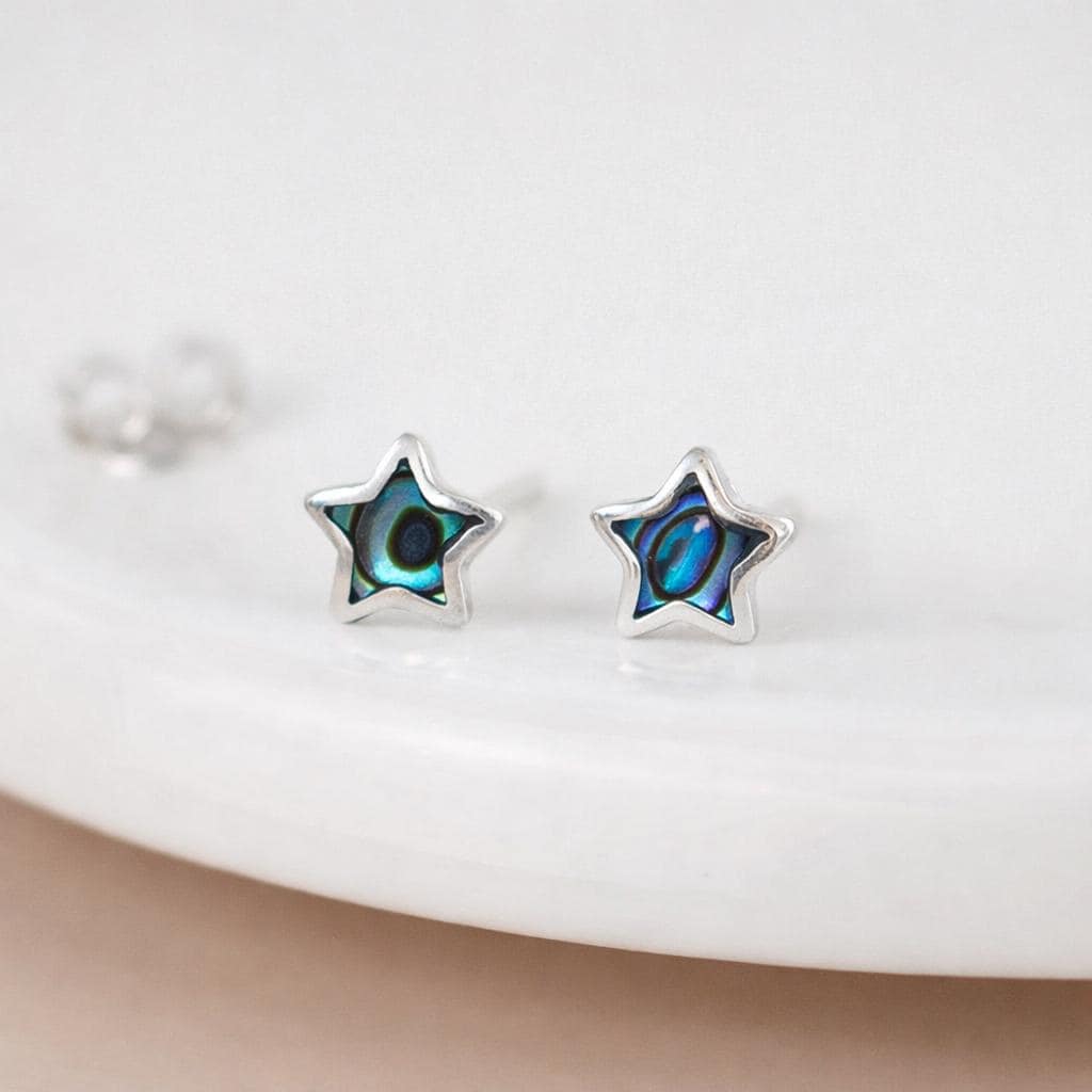 These abalone star stud earrings are handcrafted from solid 925 sterling silver and set with shimmering abalone paua shell, creating a petite star design with natural blue and green iridescence.