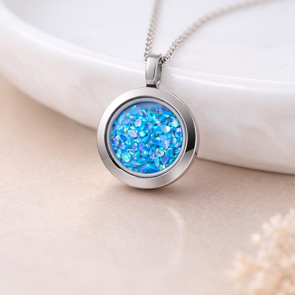 This personalised crushed opal locket necklace is crafted from solid stainless steel and finished in a smooth, polished silver tone. Designed with a secure screw front opening, this locket offers a discreet and meaningful way to hold something deeply personal close to you such as ashes or hair.