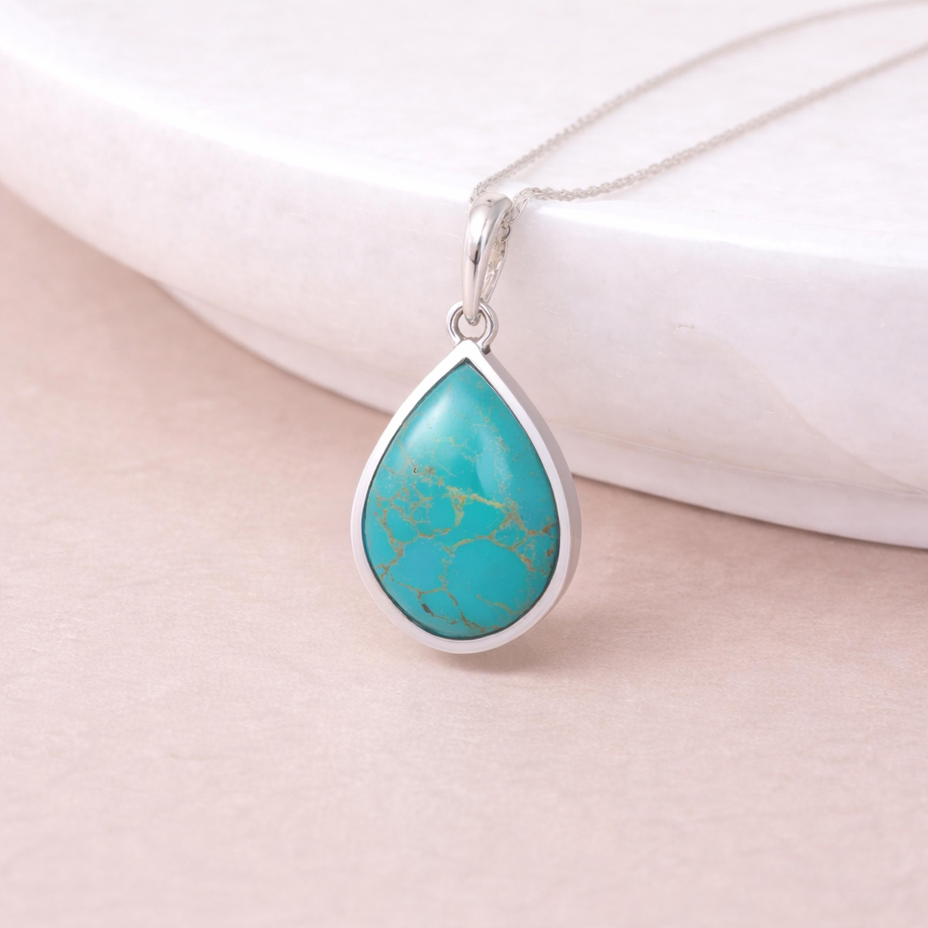 The pendant measures approximately 24.00mm in height and 14.00mm in width, with a weight of around 3.08g. The smooth teardrop silhouette highlights the soft, even colour of the turquoise, while the polished silver setting frames the stone beautifully for a clean, refined finish.