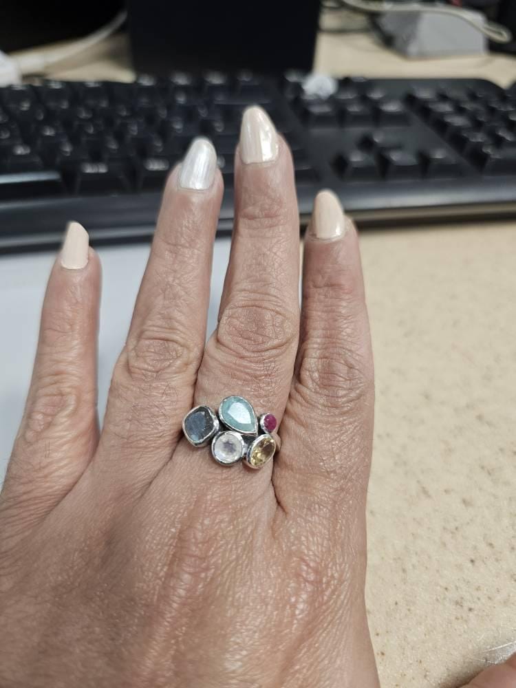 This Handcrafted Multi Gemstone Ring is crafted from solid 925 sterling silver and set with a vibrant combination of ruby quartz, rainbow moonstone, labradorite, citrine, and amazonite, creating a beautifully colourful and distinctive statement piece. Bold yet balanced, this design celebrates natural gemstones in a striking clustered arrangement.