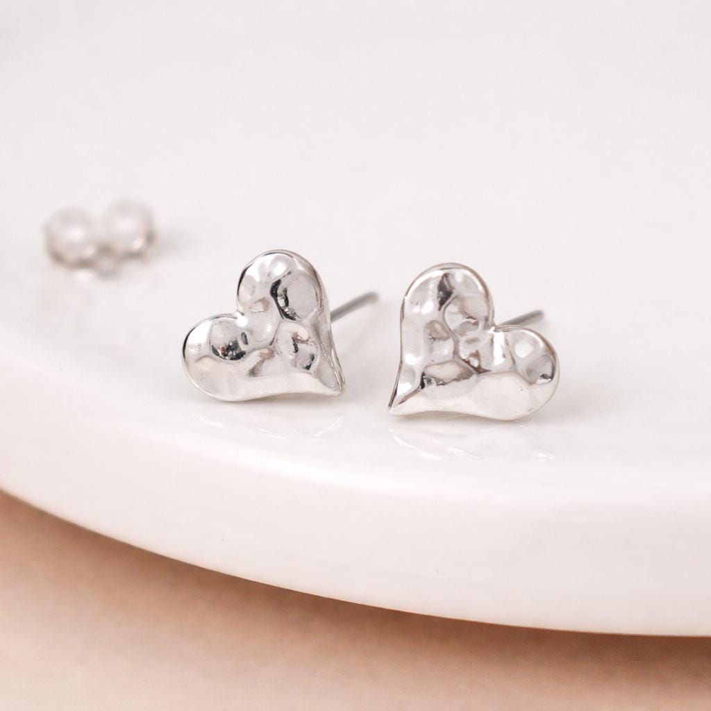 These hammered heart stud earrings are crafted from brass with a sterling silver-plated finish, featuring a softly textured surface that reflects the light beautifully. Nickel free, they are designed for comfortable everyday wear and make an eye-catching yet easy-to-style accessory.