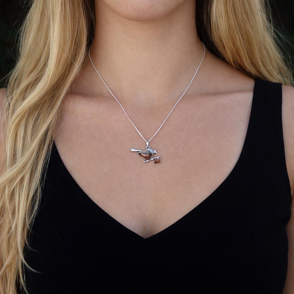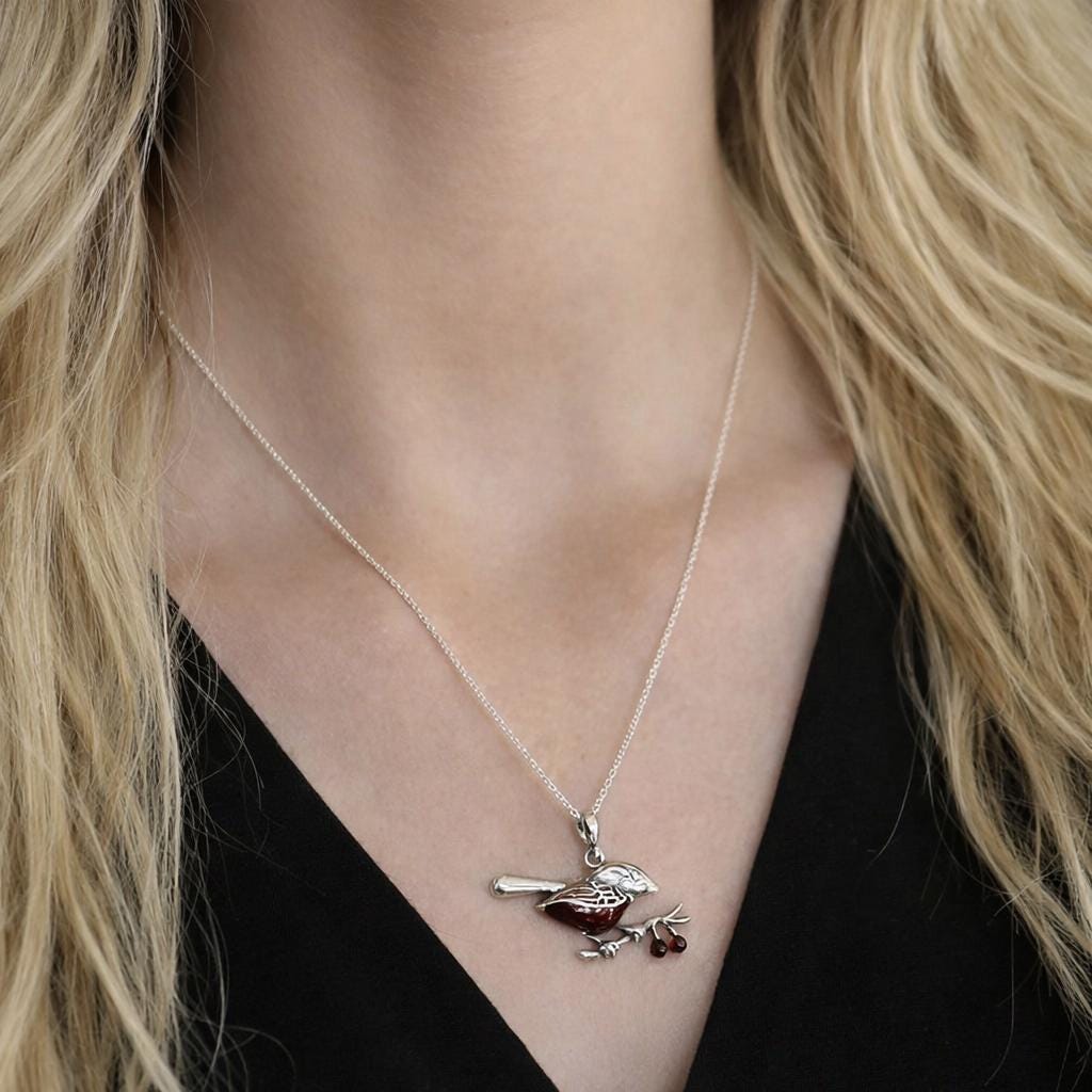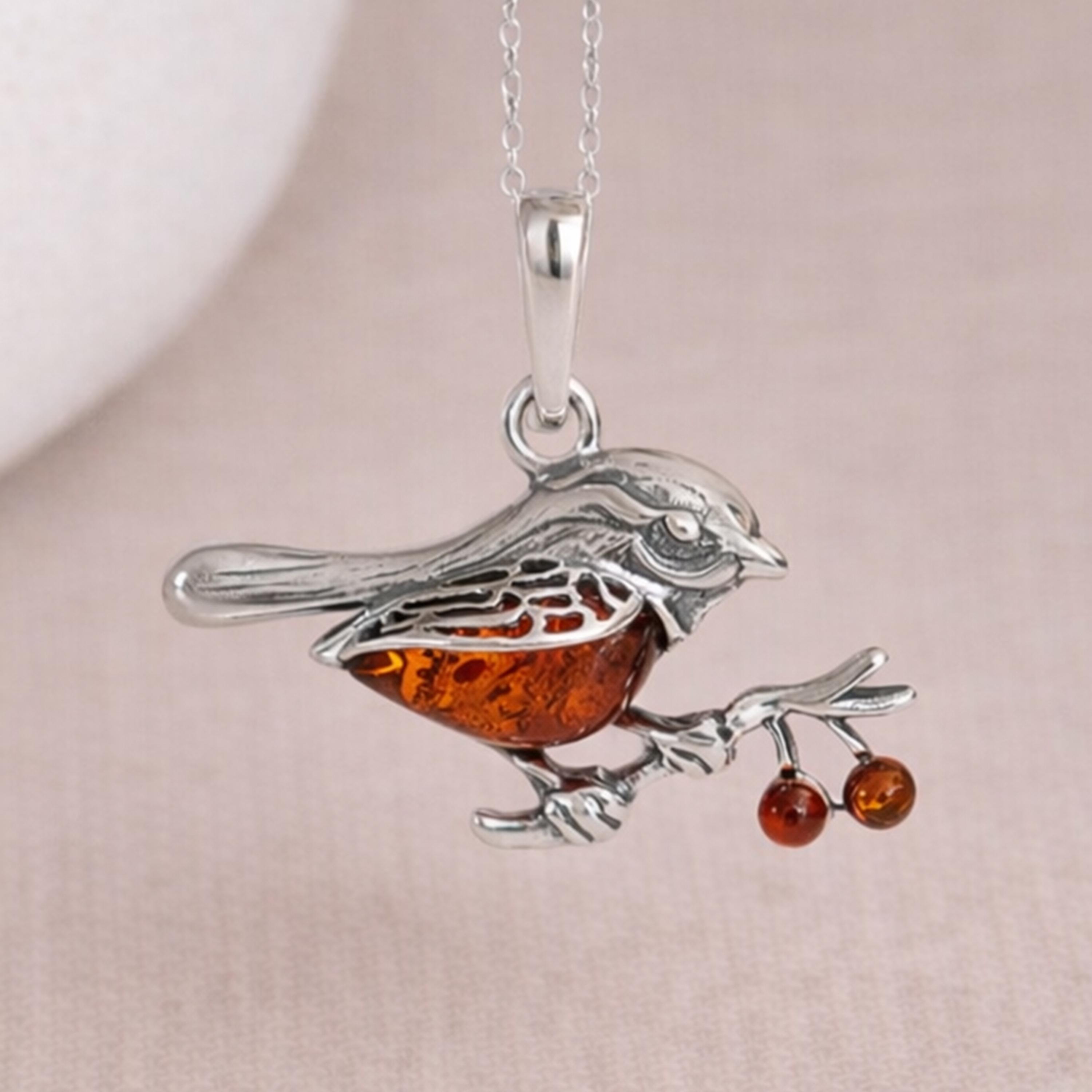 This sterling silver robin necklace is handcrafted from solid 925 sterling silver and set with genuine Baltic amber, creating a detailed and meaningful nature-inspired pendant.