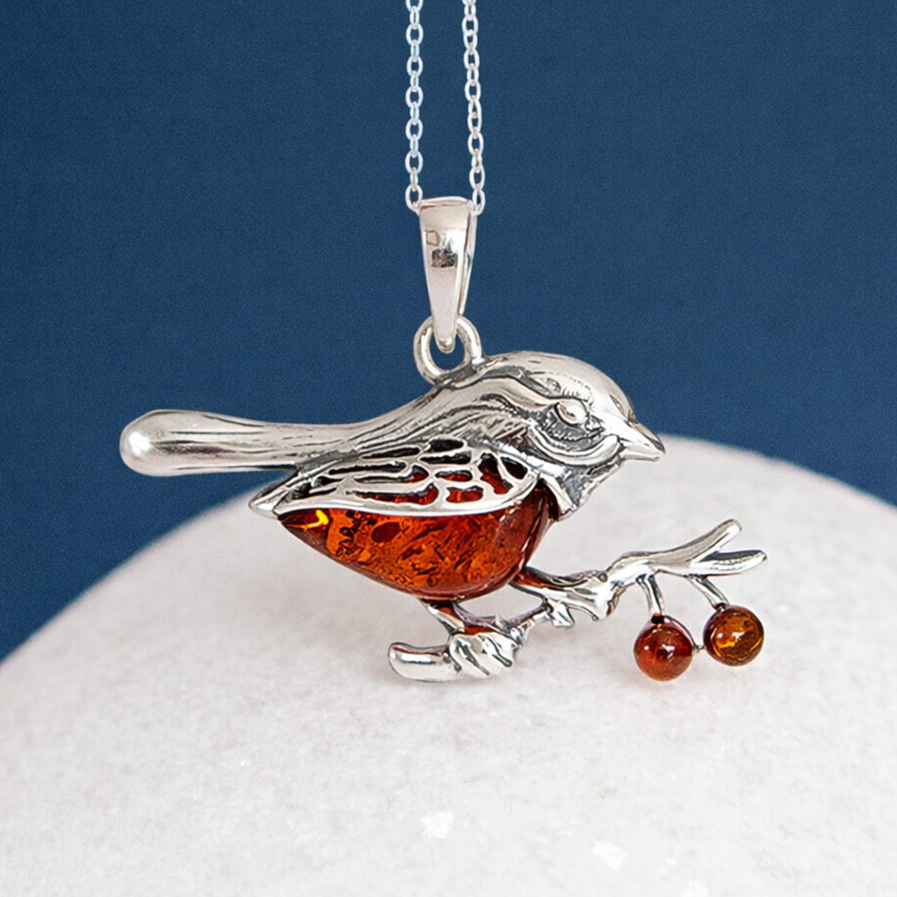 Each pendant is made in small batches, with careful attention given to every stage of the process. The amber is individually selected and hand-set, then gently polished to highlight its warm tones and natural inclusions. The robin design features fine feather detailing and a softly sculpted form, with tiny amber berries adding a charming finishing touch. No two pieces are ever the same.