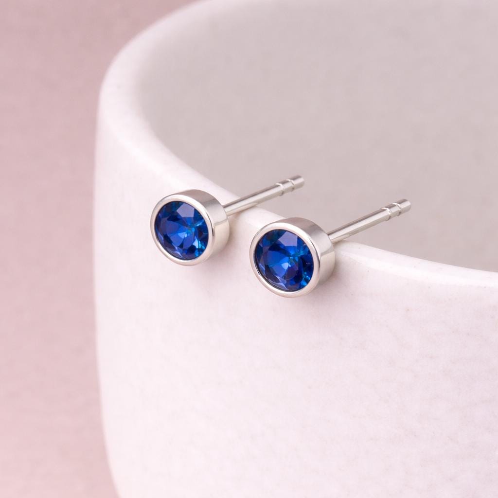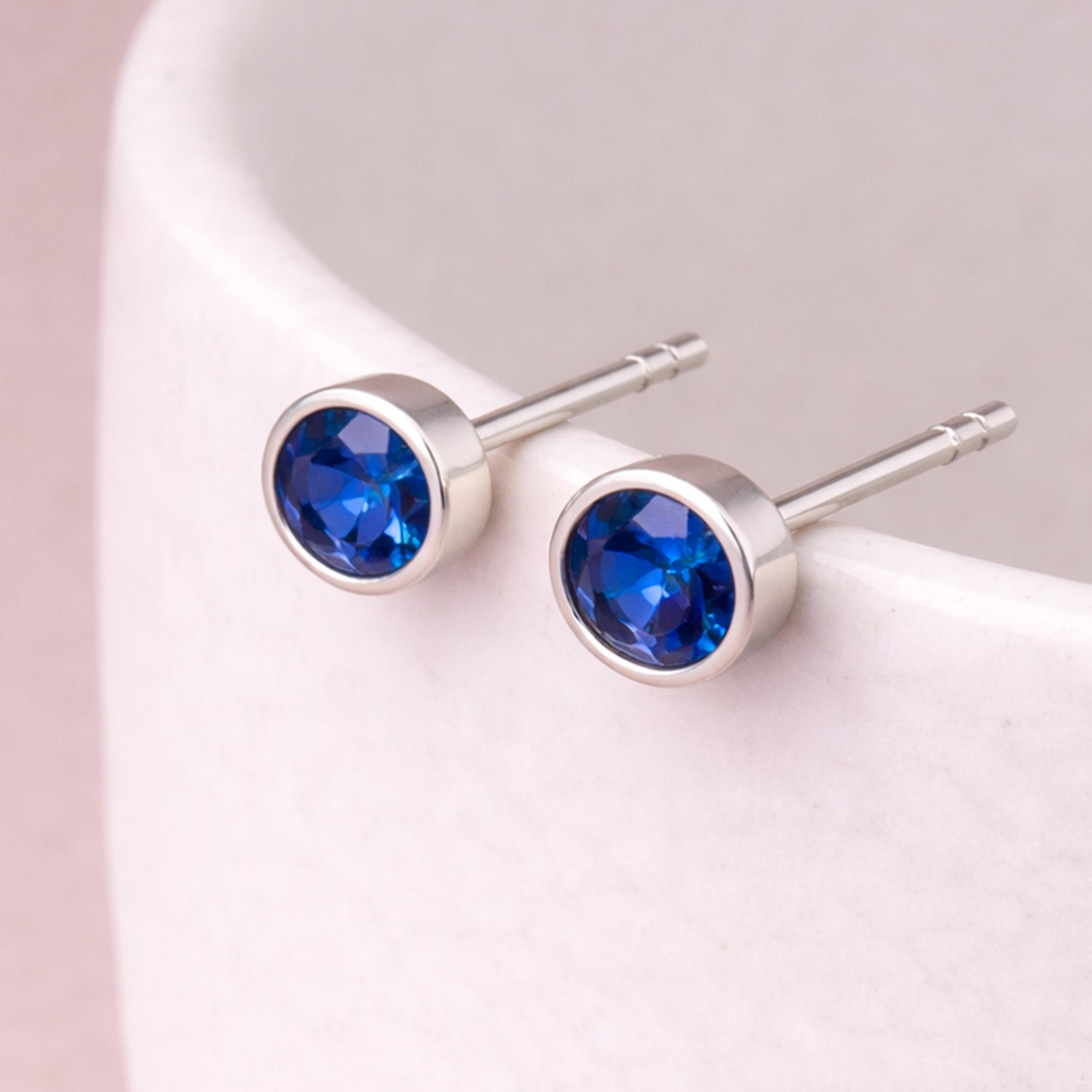 These September birthstone stud earrings are handcrafted from solid 925 sterling silver and set with a sapphire coloured cubic zirconia, creating a deep blue focal point with a classic, elegant finish.