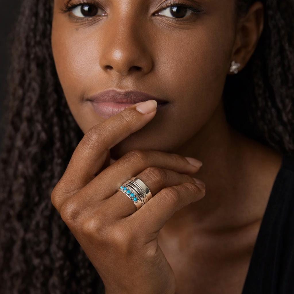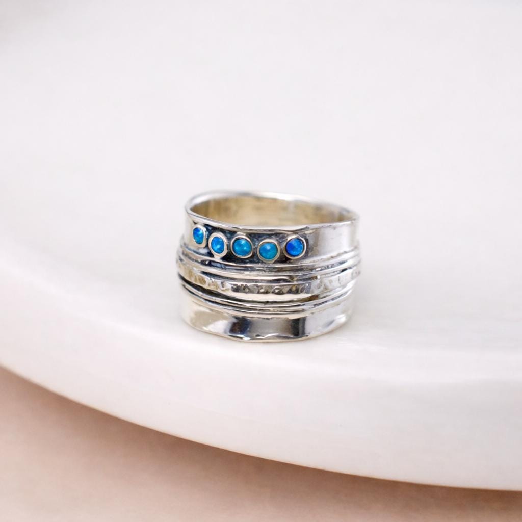 Sculptural and luminous — this bold molten-style ring features five radiant blue opals set into a wide, textured band of sterling silver. The organic shape flows naturally around the finger with soft edges and an undulating surface, giving it a handmade, elemental feel.