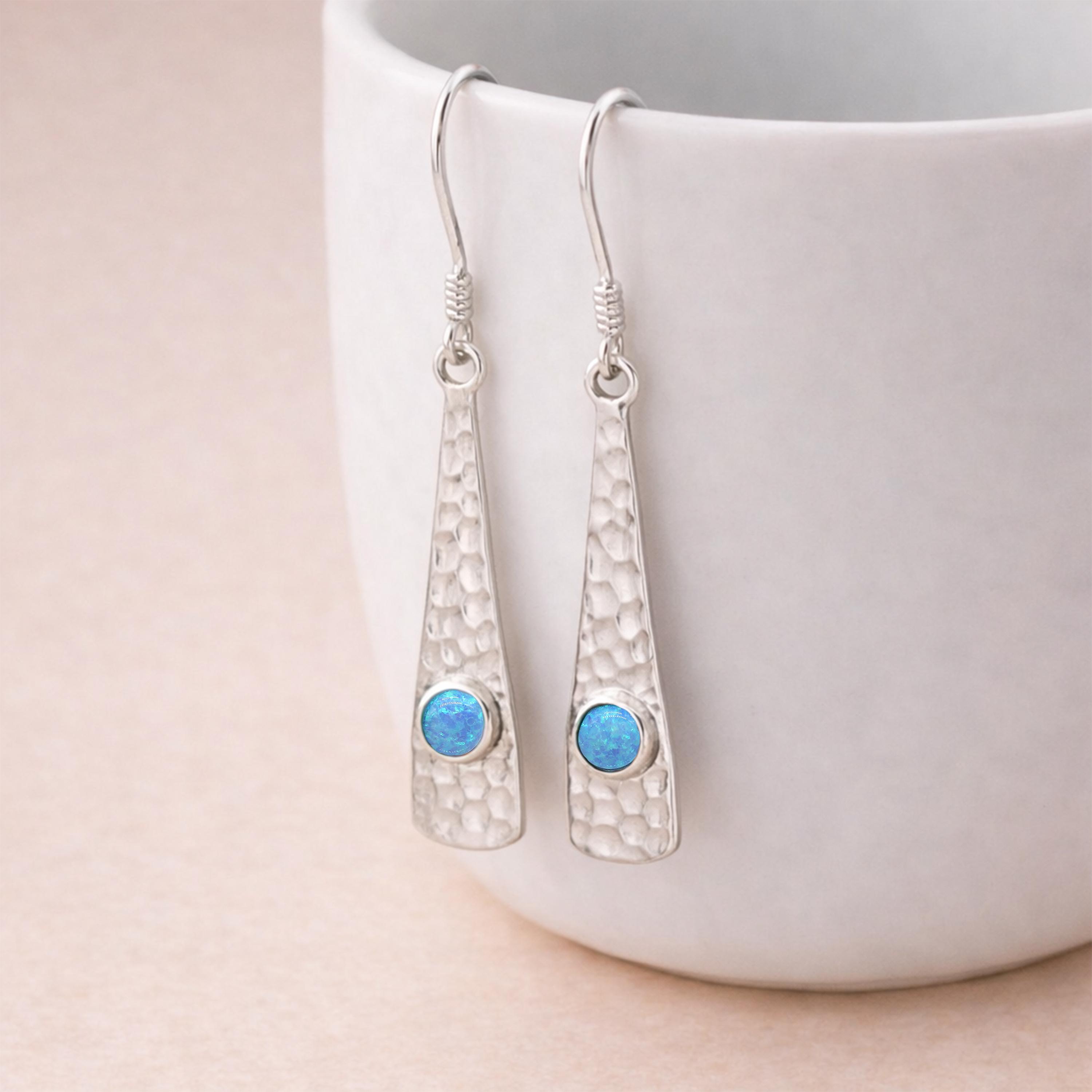 Elegant with a handcrafted edge — these Sterling Silver Drop Earrings feature a gently tapered hammered design, finished with a vibrant 4mm lab-created blue opal. The textured silver adds organic depth, while the glowing opal adds a flash of colour and magic.