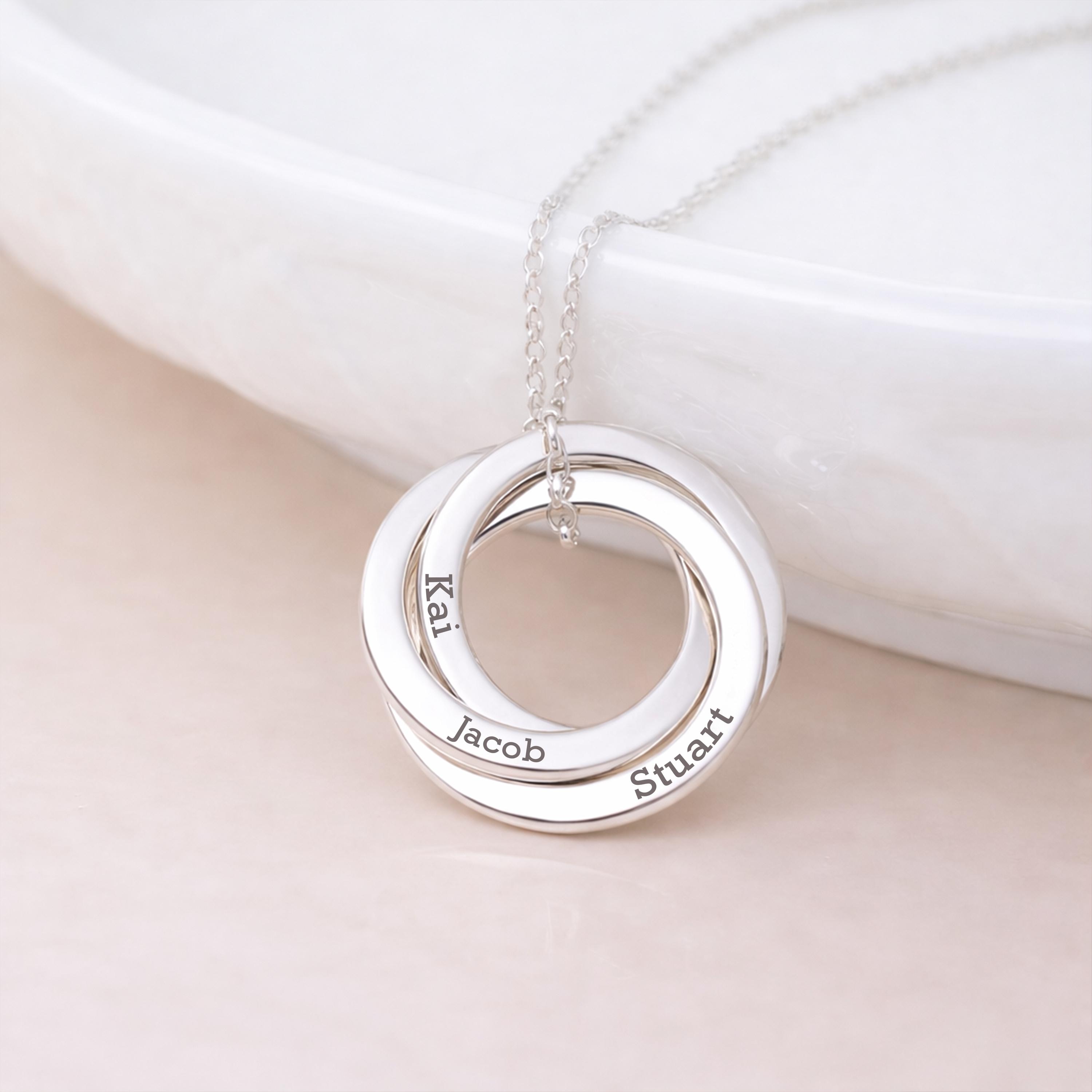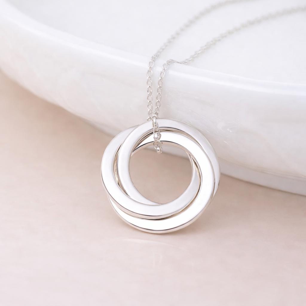 This Personalised Interlocking Rings Necklace is crafted from solid 925 sterling silver and finished in a bright polished silver tone. Featuring three beautifully interwoven rings, this elegant design symbolises connection, love, and the unbreakable bonds between family members.