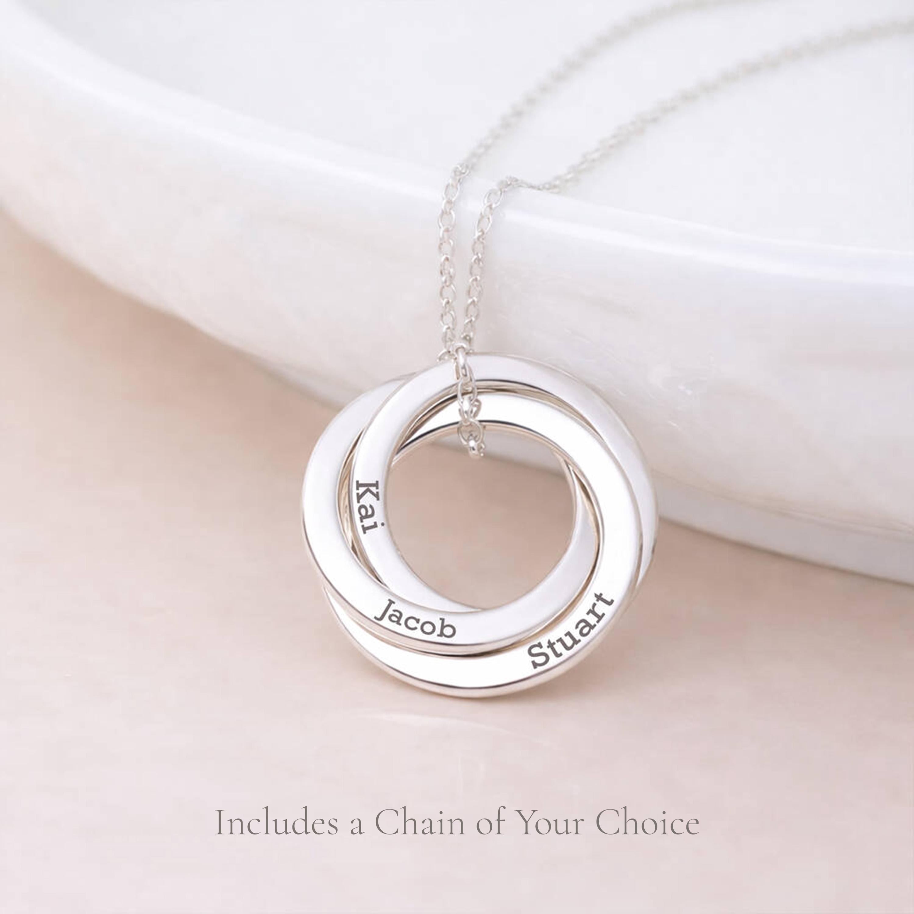 This Personalised Interlocking Rings Necklace is crafted from solid 925 sterling silver and finished in a bright polished silver tone. Featuring three beautifully interwoven rings, this elegant design symbolises connection, love, and the unbreakable bonds between family members.