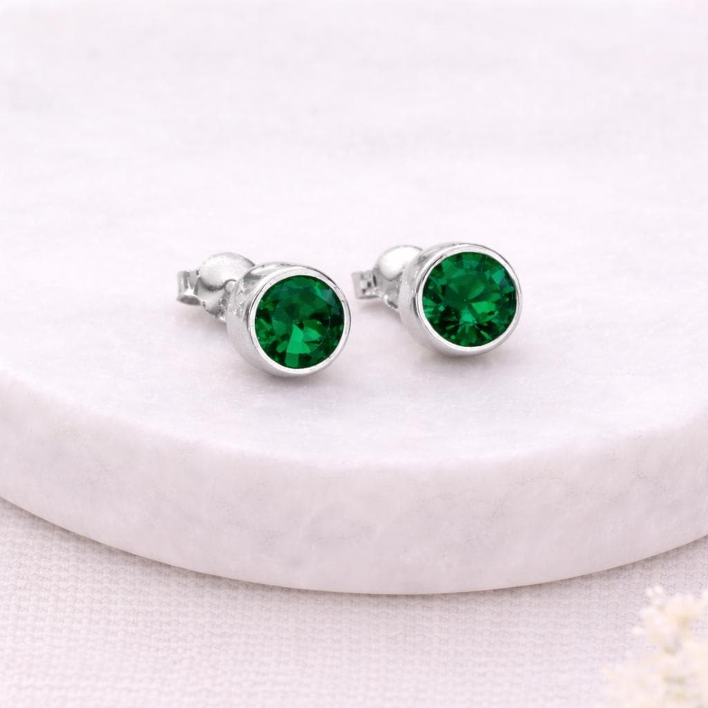 Each pair features a round emerald cubic zirconia stone bezel set in polished sterling silver, giving a clean, modern finish while keeping the stone secure. The rich green colour adds a classic pop of colour that works beautifully for both daily wear and special occasions.