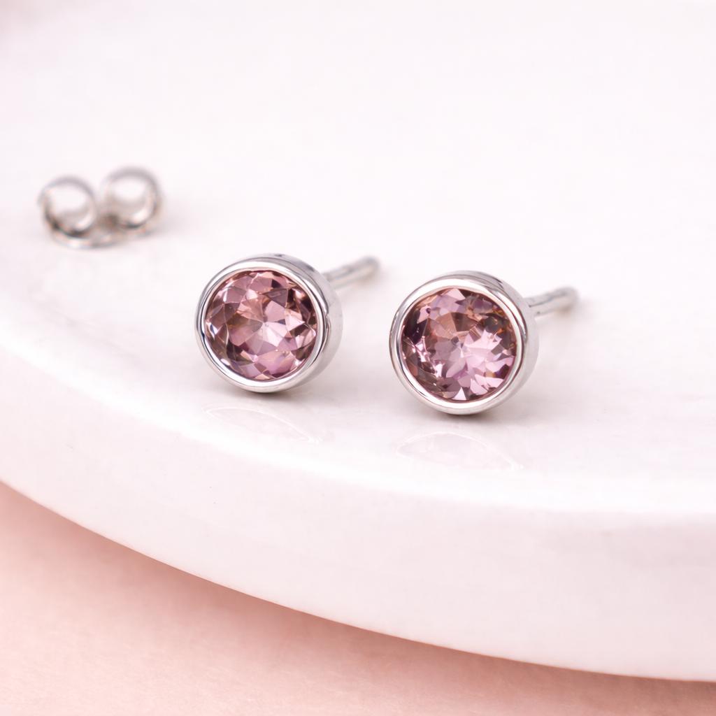 These sterling silver June birthstone stud earrings are handcrafted with a smooth bezel set lilac alexandrite coloured cubic zirconia, offering a refined design with soft purple tones.