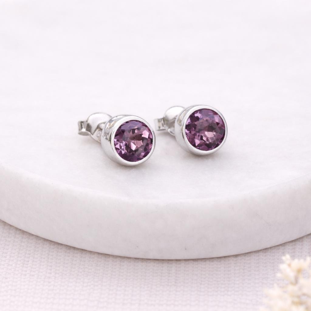 Each pair is made by hand in our UK studio, with the stone chosen for its subtle lilac sparkle and elegant finish. Alexandrite is an alternative birthstone for June and represents balance, intuition, and personal growth. This stone is non colour changing, displaying a consistent lilac hue ideal for everyday wear.