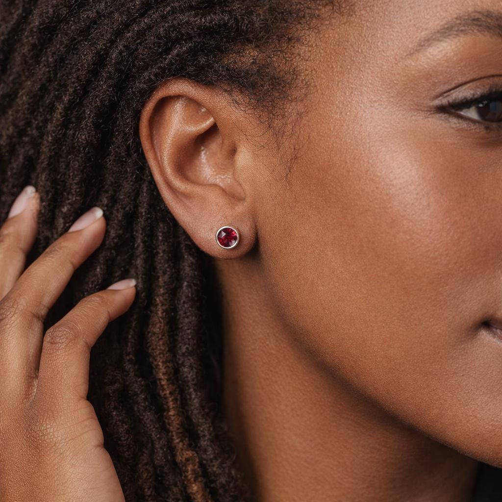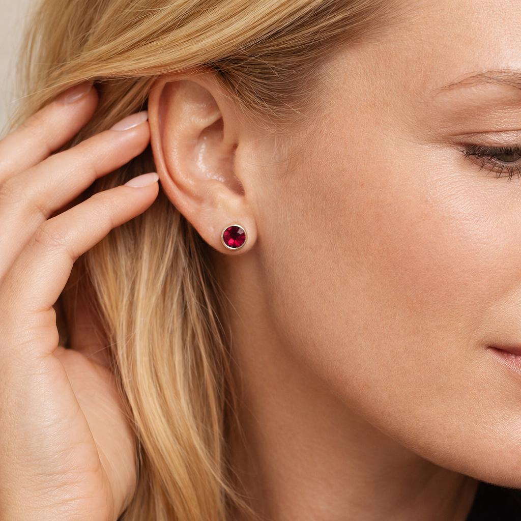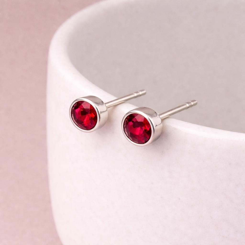 These sterling silver July birthstone stud earrings are handcrafted with a smooth bezel set ruby coloured cubic zirconia, offering a classic design with rich red tones.