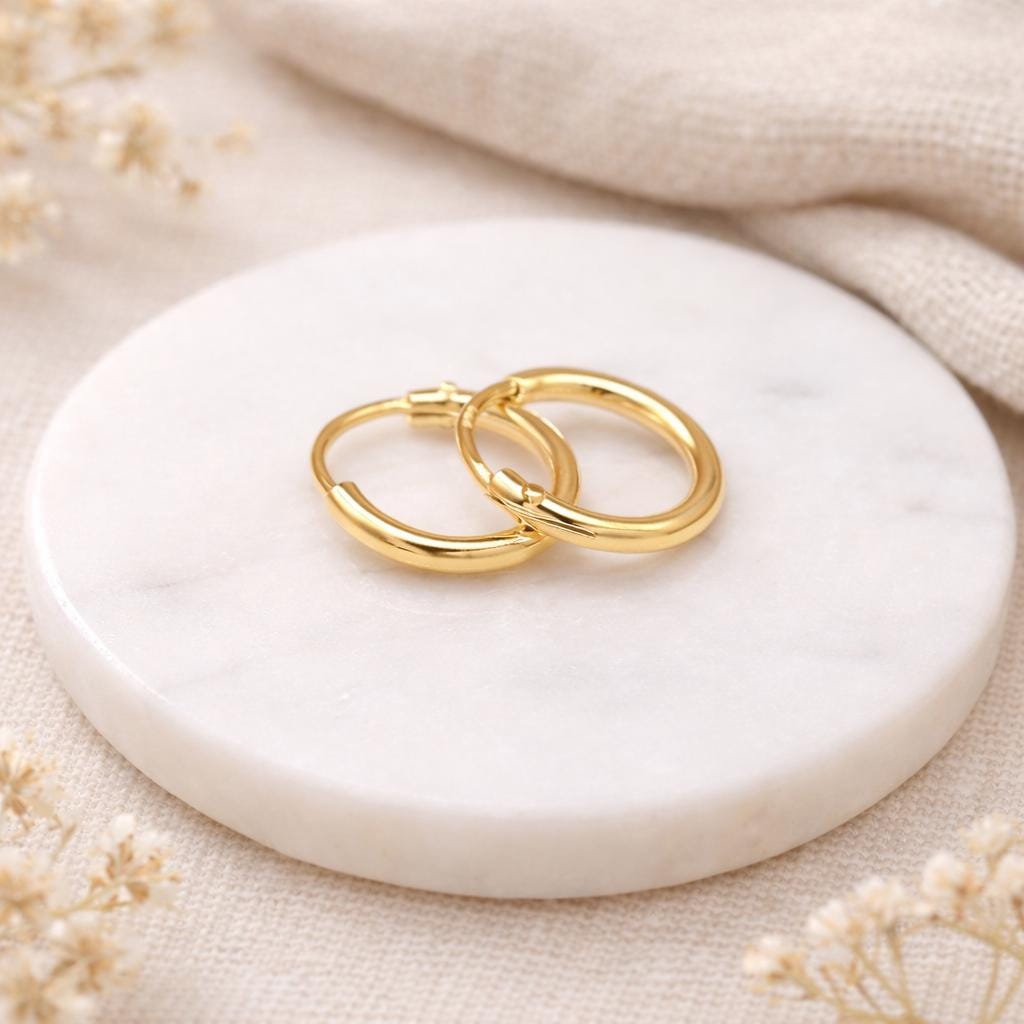 Understated and beautifully versatile, these 10mm gold plated sterling silver hoop earrings are handcrafted from solid 925 sterling silver with 18ct yellow gold plating and polished to a soft, reflective finish for effortless everyday wear.