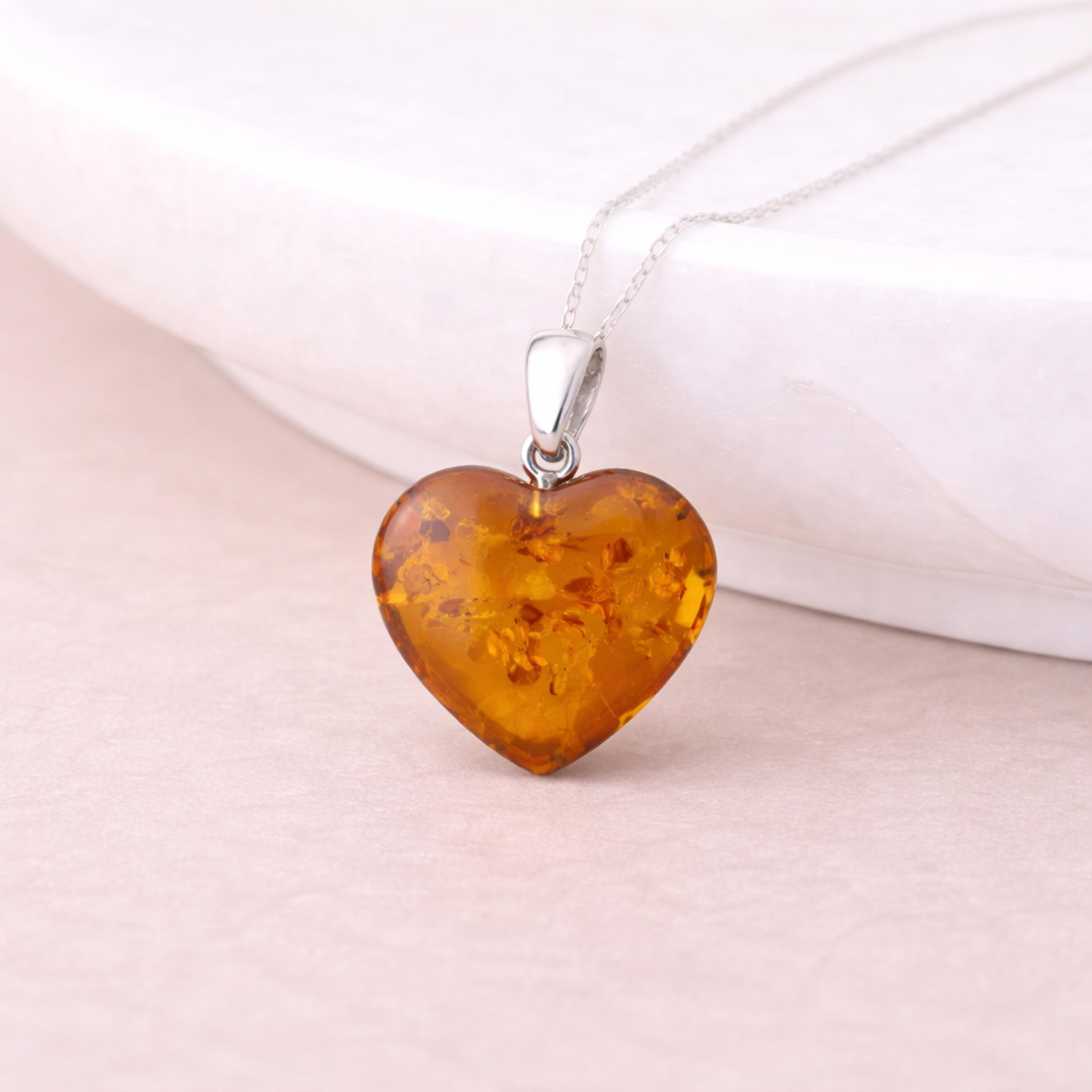 The heart-shaped Baltic amber measures approximately 27mm in height, including the bail, and 20mm in width, with a depth of around 8mm, creating a softly rounded silhouette that feels smooth and comfortable when worn. The amber displays warm honey to deep cognac tones with natural internal textures that shimmer when they catch the light.