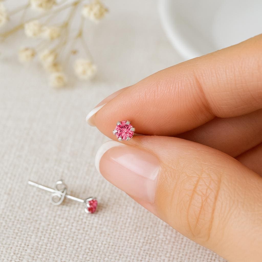 Tiny but full of sparkle — these micro pink tourmaline-inspired stud earrings are delicate, elegant, and designed for everyday wear. Crafted from solid sterling silver and set with 3mm faceted cubic zirconia, they’re the perfect pop of soft pink, especially for second piercings or minimalist styling.