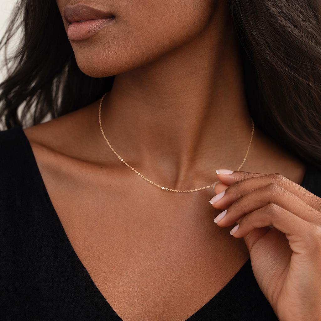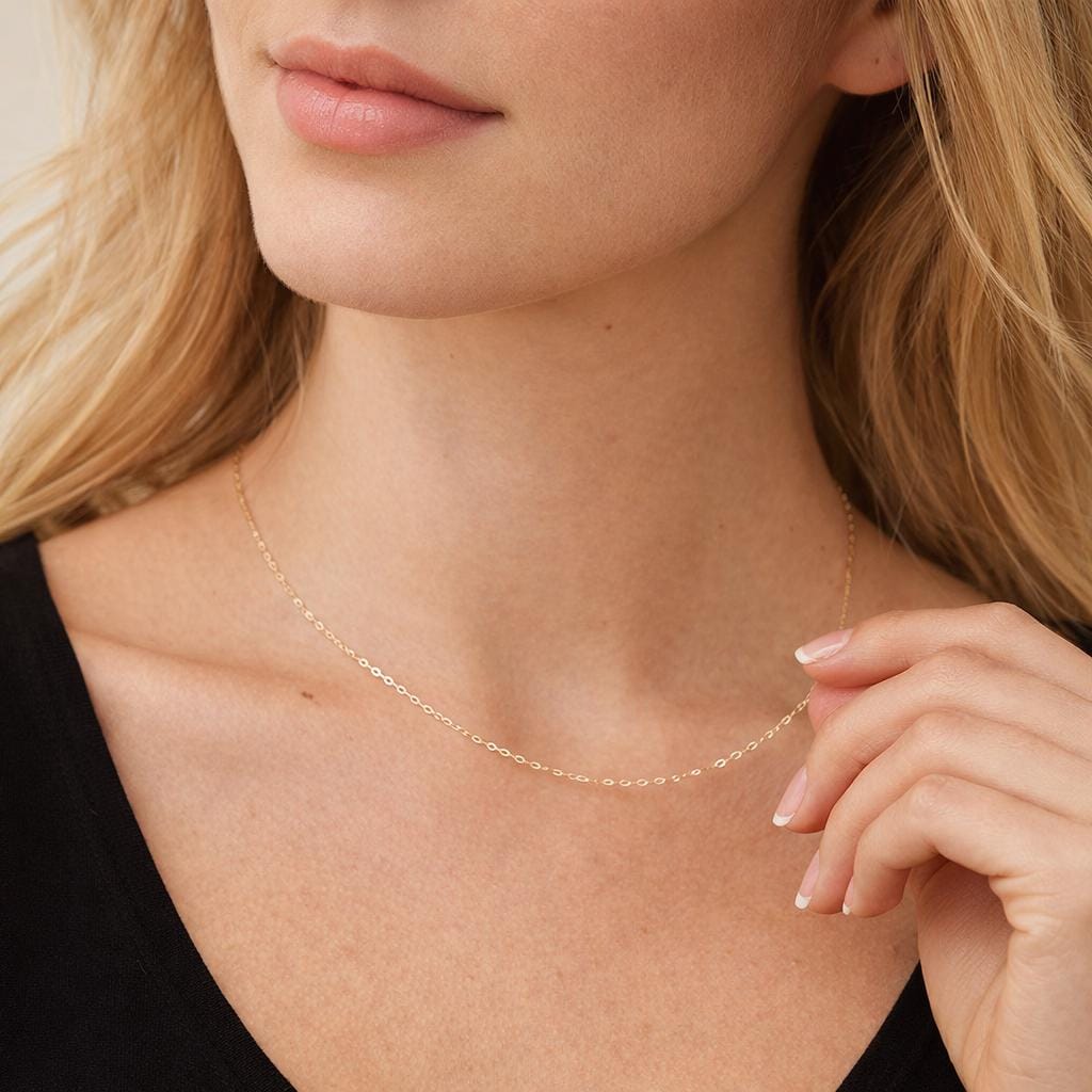 This trace chain pairs beautifully with a wide range of gold pendants, from small charms to simple lockets, offering a clean and understated base that allows the pendant to remain the focal point.