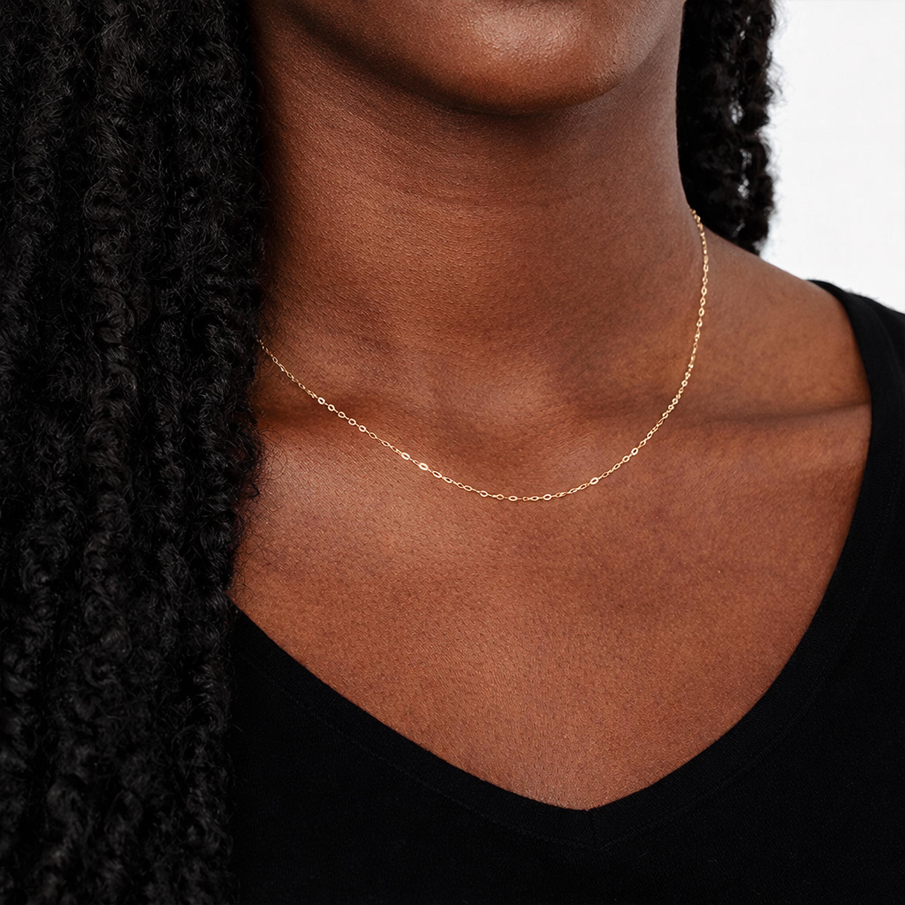 The trace chain features evenly spaced oval links that give it a light, fluid drape and a delicate appearance. At 1.2mm wide, it strikes a balanced profile that is subtle yet noticeable, allowing pendants to remain the focal point while the chain adds a soft, warm finish. The open link design allows the chain to move naturally and sit comfortably against the skin.