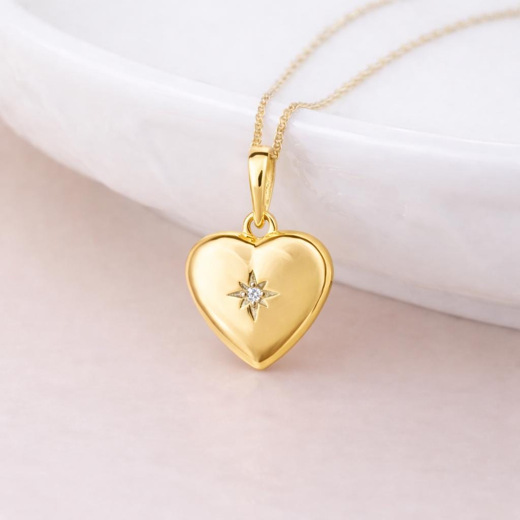 Låt kärleken lysa starkt med vårt himmelskt inspirerade medaljong med guldstjärna – ett polerat minnesmärke tillverkat av massivt sterlingsilver och lyxigt pläterat i 18 karat gult guld. En strålande Nordstjärna infattad med en glittrande kubisk zirkonia pryder framsidan, medan baksidan erbjuder plats för ett personligt graverat meddelande och insidan rymmer två älskade foton.