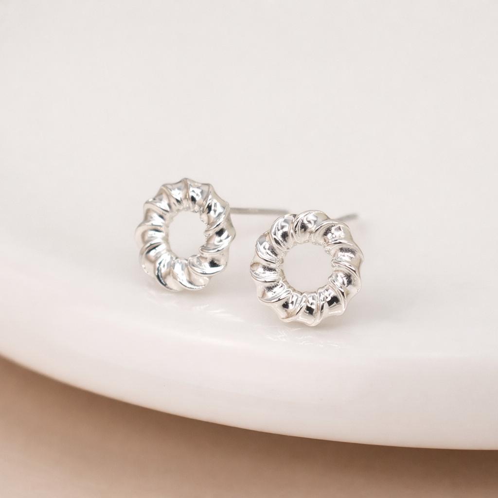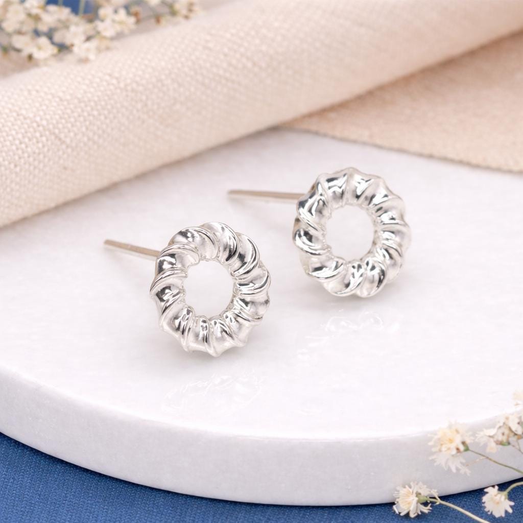 These sterling silver swirl circle stud earrings are handcrafted from solid 925 sterling silver and finished with a smooth, polished surface, featuring an open circular design with softly twisted, sculptural detail.