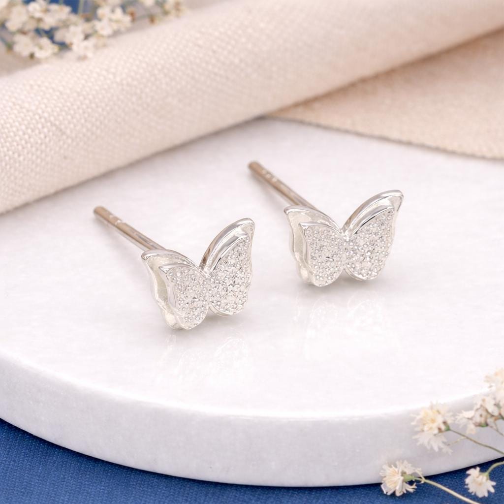 These double layer butterfly stud earrings are handcrafted from solid 925 sterling silver, featuring a softly textured layered butterfly design that catches the light beautifully.
