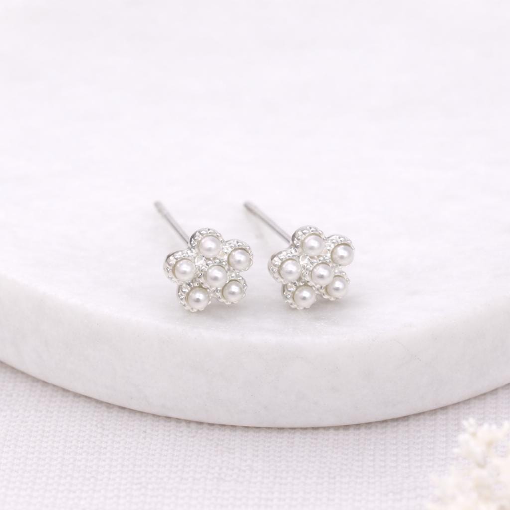 These sterling silver pearl cluster stud earrings are handcrafted from solid 925 sterling silver and finished with delicate faux white seed pearls, arranged in a soft floral style cluster.