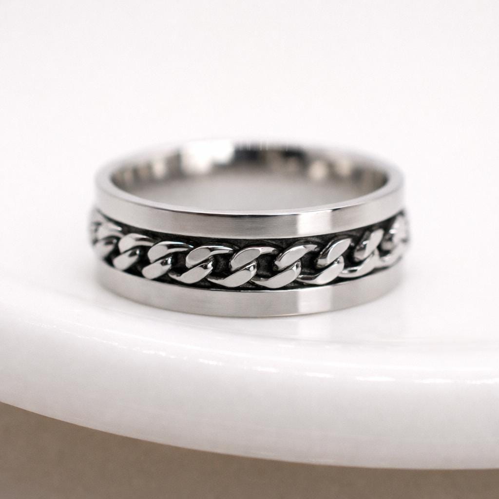 A handcrafted sterling silver spinner ring featuring a wide polished band with a chain-style rotating silver centre.