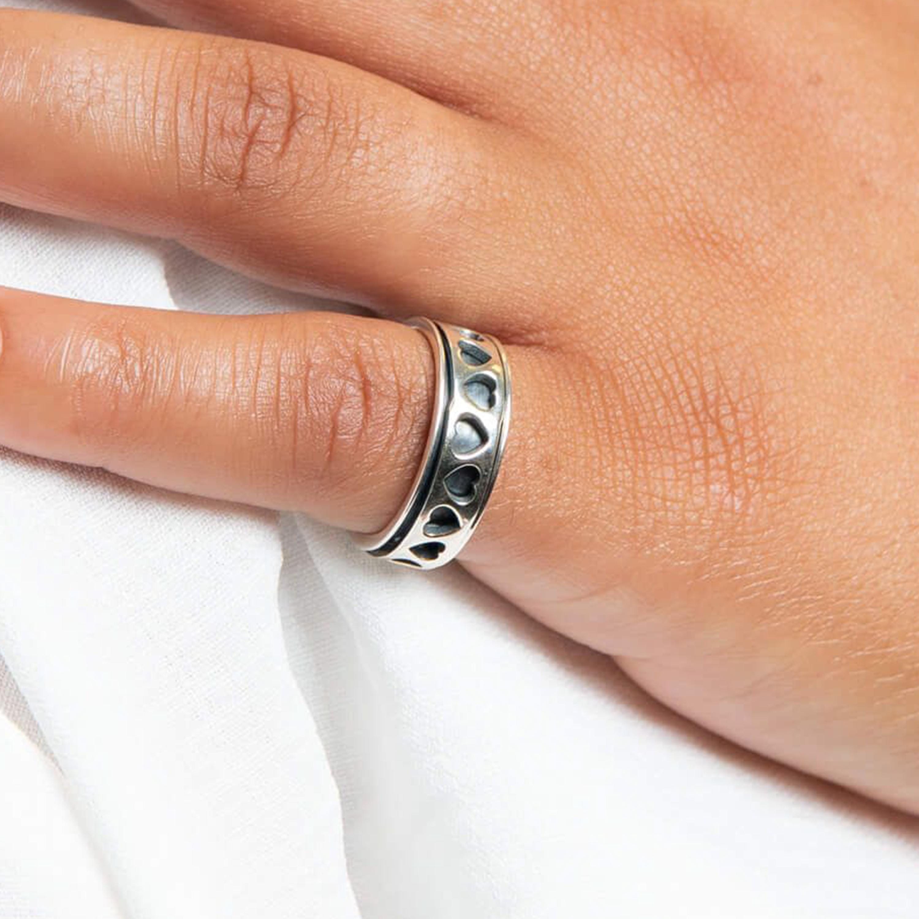 This handcrafted sterling silver spinner ring features a smooth wide band with a rotating silver spinner detailed with cut-out heart motifs, creating a meaningful everyday ring with gentle movement.