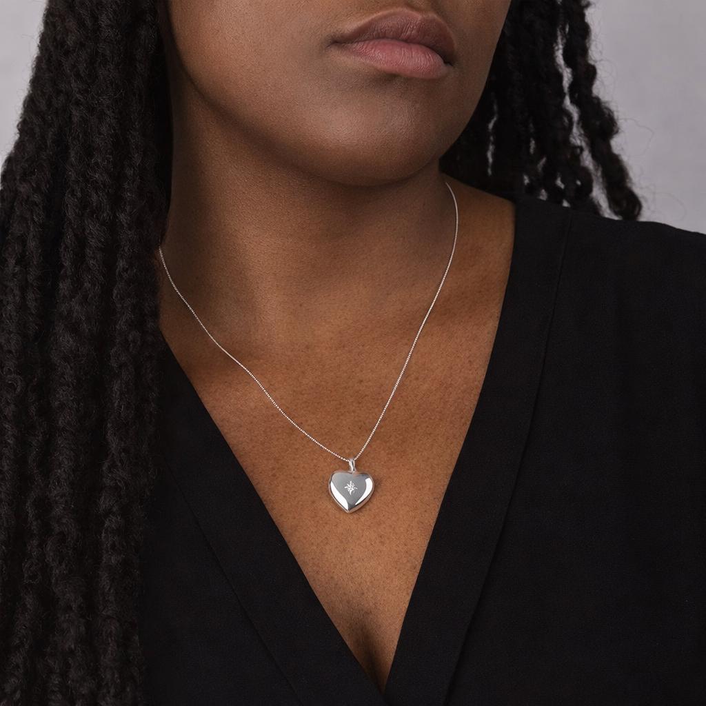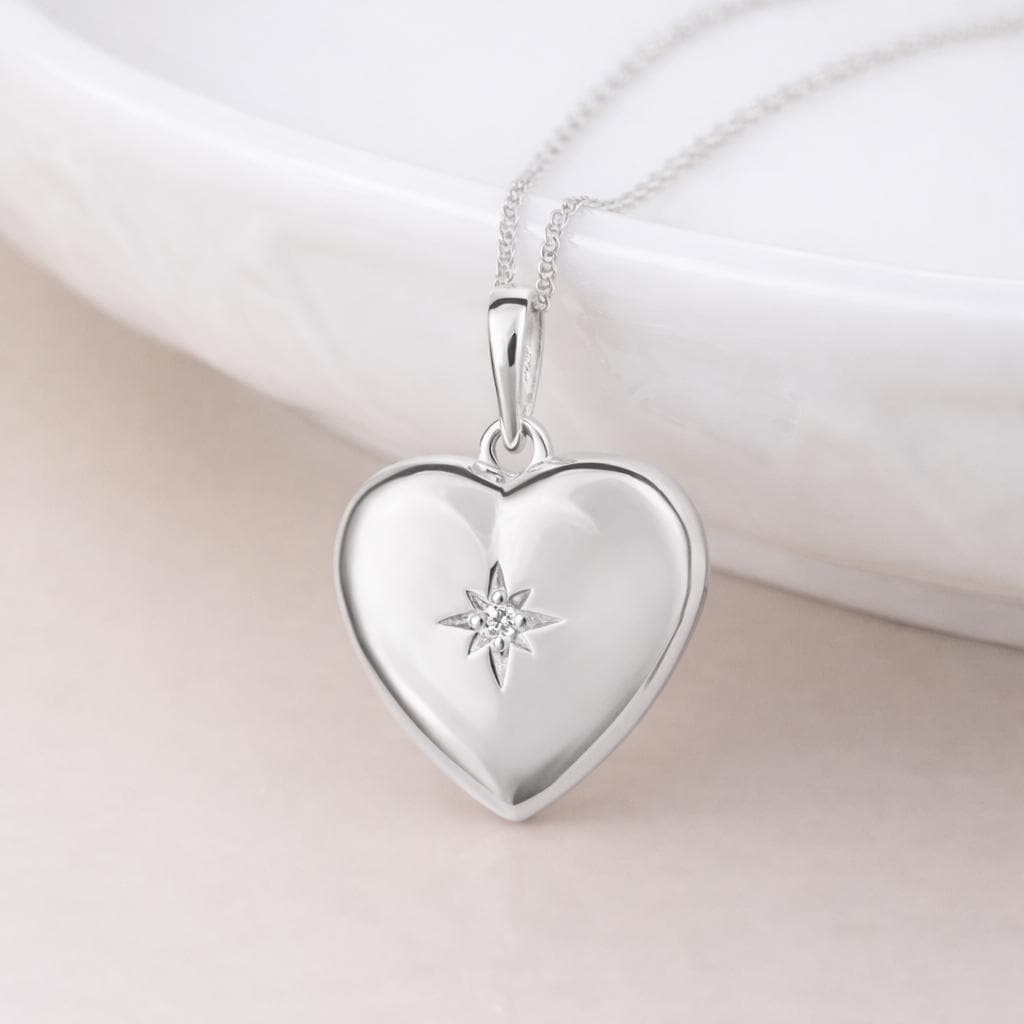 Guided by love and starlight, our radiant Star-Set Heart Locket pendant is a meaningful keepsake crafted from solid sterling silver, featuring a delicate North Star design set with a shimmering cubic zirconia gemstone.