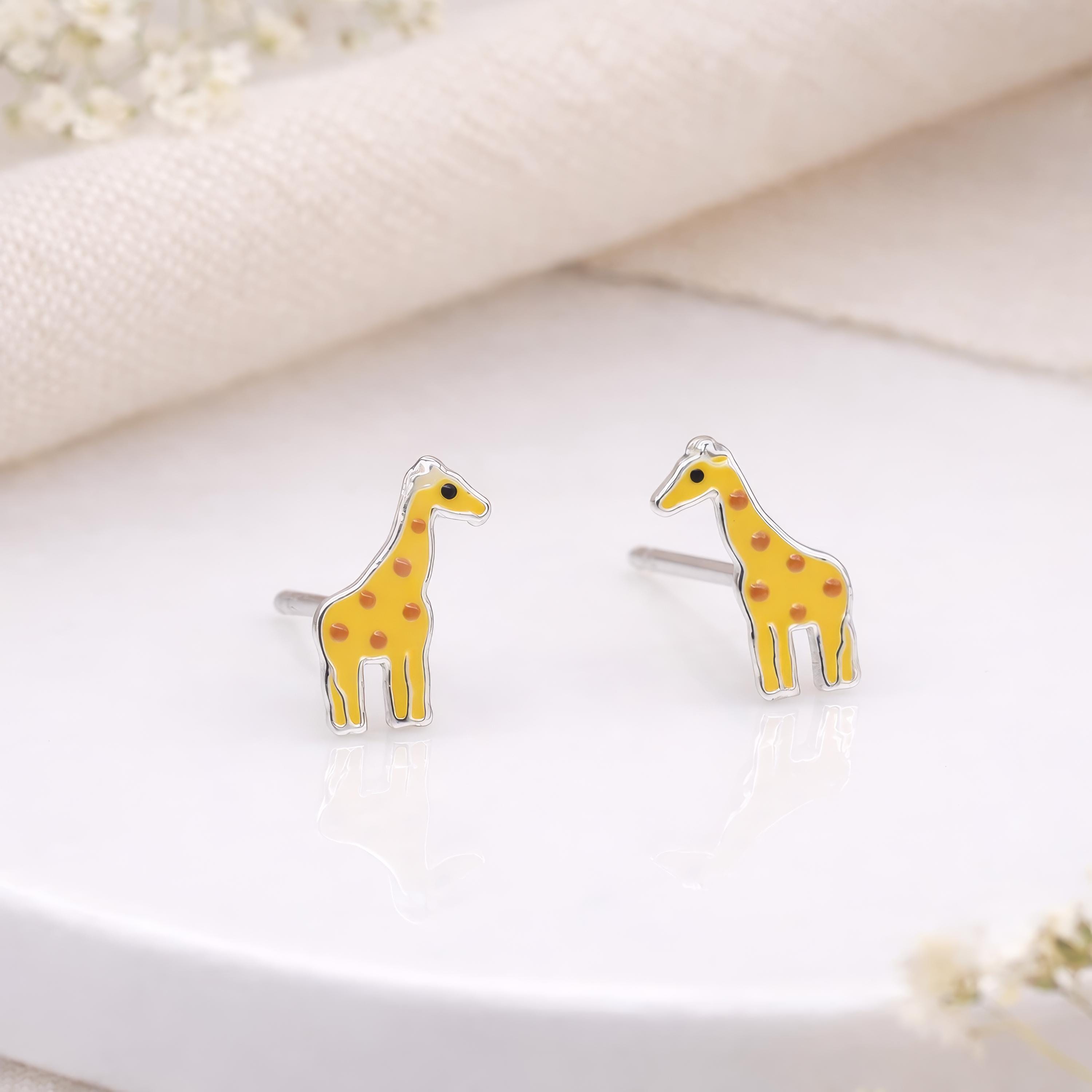 These giraffe stud earrings are crafted from solid 925 sterling silver and finished with sunny yellow enamel detailing, creating a fun and characterful design inspired by this much-loved animal. Nickel free and hypoallergenic, they are gentle on sensitive ears and comfortable for everyday wear.
