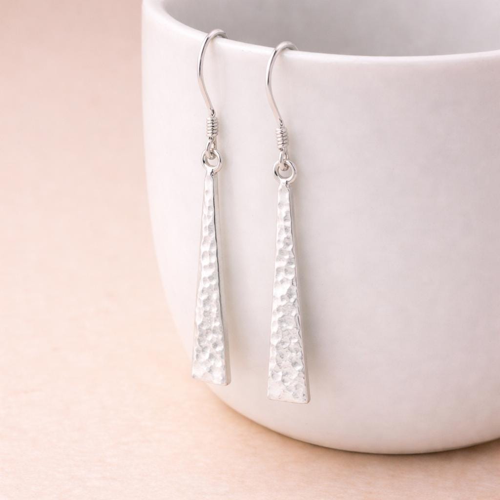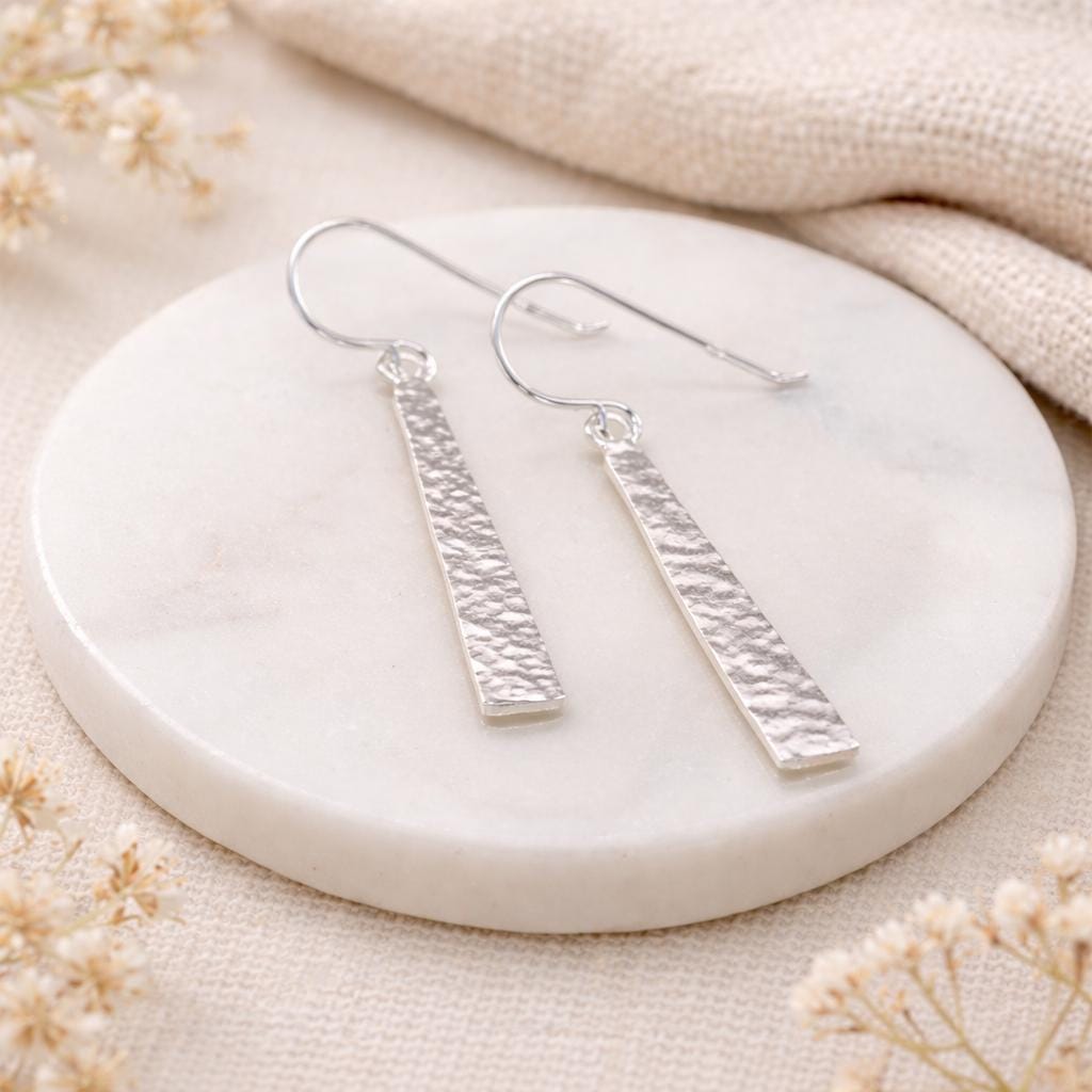 Each earring features a slim rectangular bar with a gently hammered surface, creating subtle variations that make every pair feel unique. Suspended from fine sterling silver hooks, the elongated 35mm drop adds movement and a clean, modern silhouette while remaining lightweight and comfortable to wear all day. Their minimalist shape makes them endlessly versatile, perfect for both casual and dressed up looks.