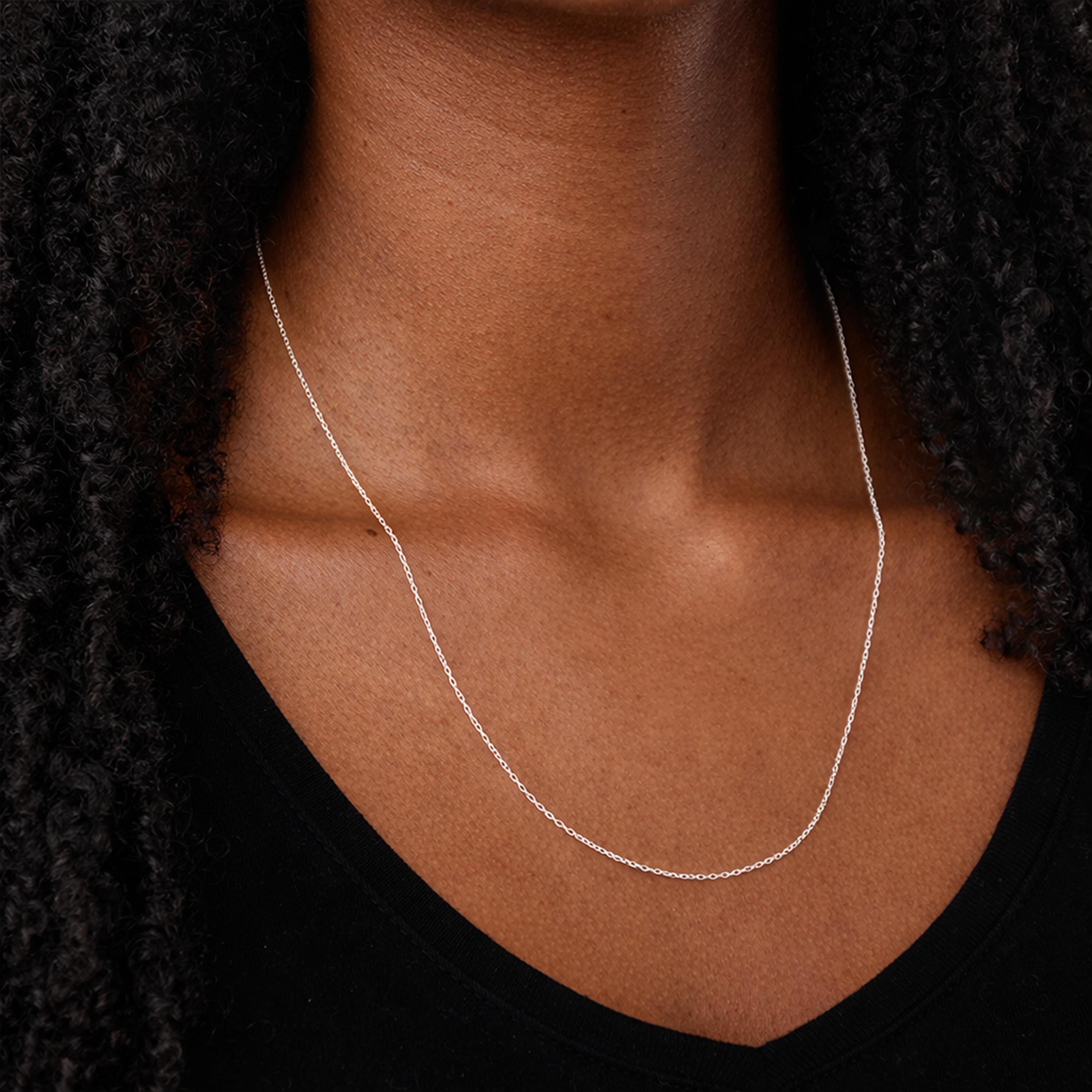 The trace chain features small, evenly spaced round links that create a smooth, flexible chain with a delicate appearance. At 1.3mm wide, it offers a subtle presence on the neck while still feeling well made and secure. This makes it ideal for wearing alone for a minimalist look, or pairing with pendants, charms, and lockets without overpowering them.